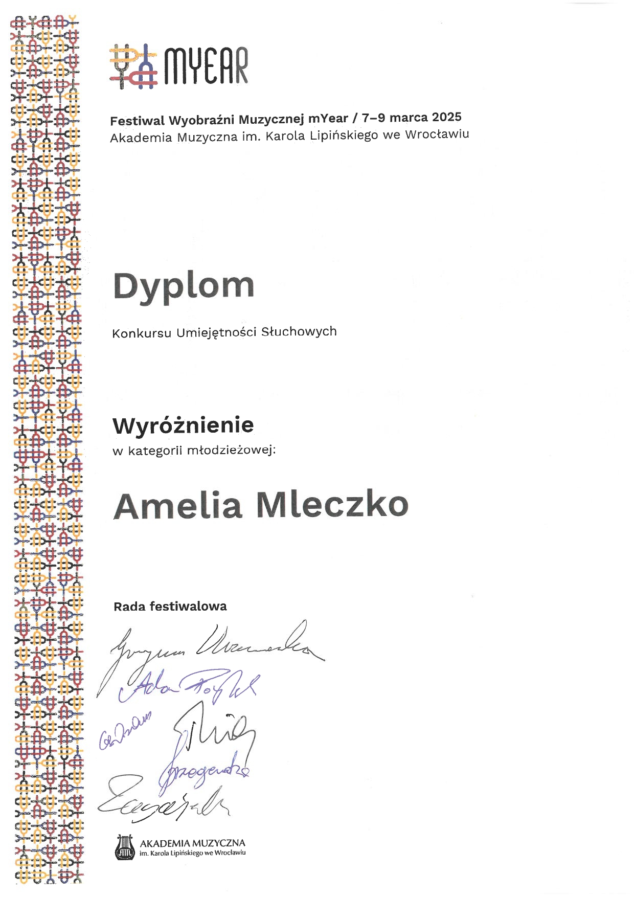 - Konkurs Umiejętności Słuchowych na Festiwalu Wyobraźni Muzycznej „mYear”, Wrocław, 7-9.03.2025 r.