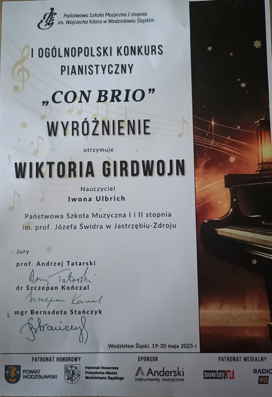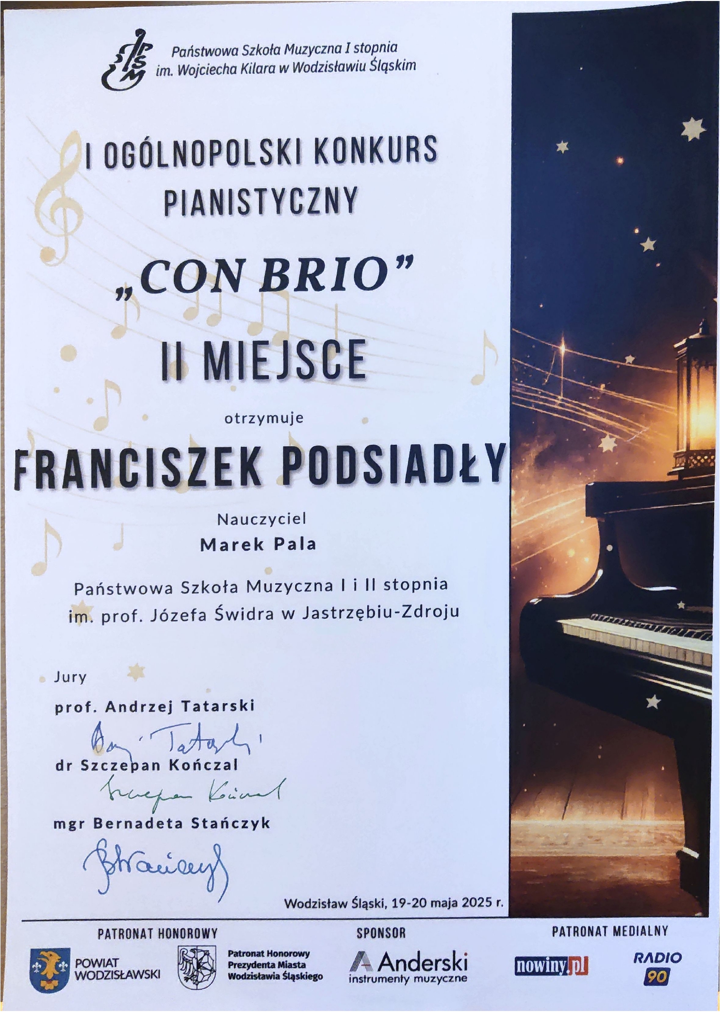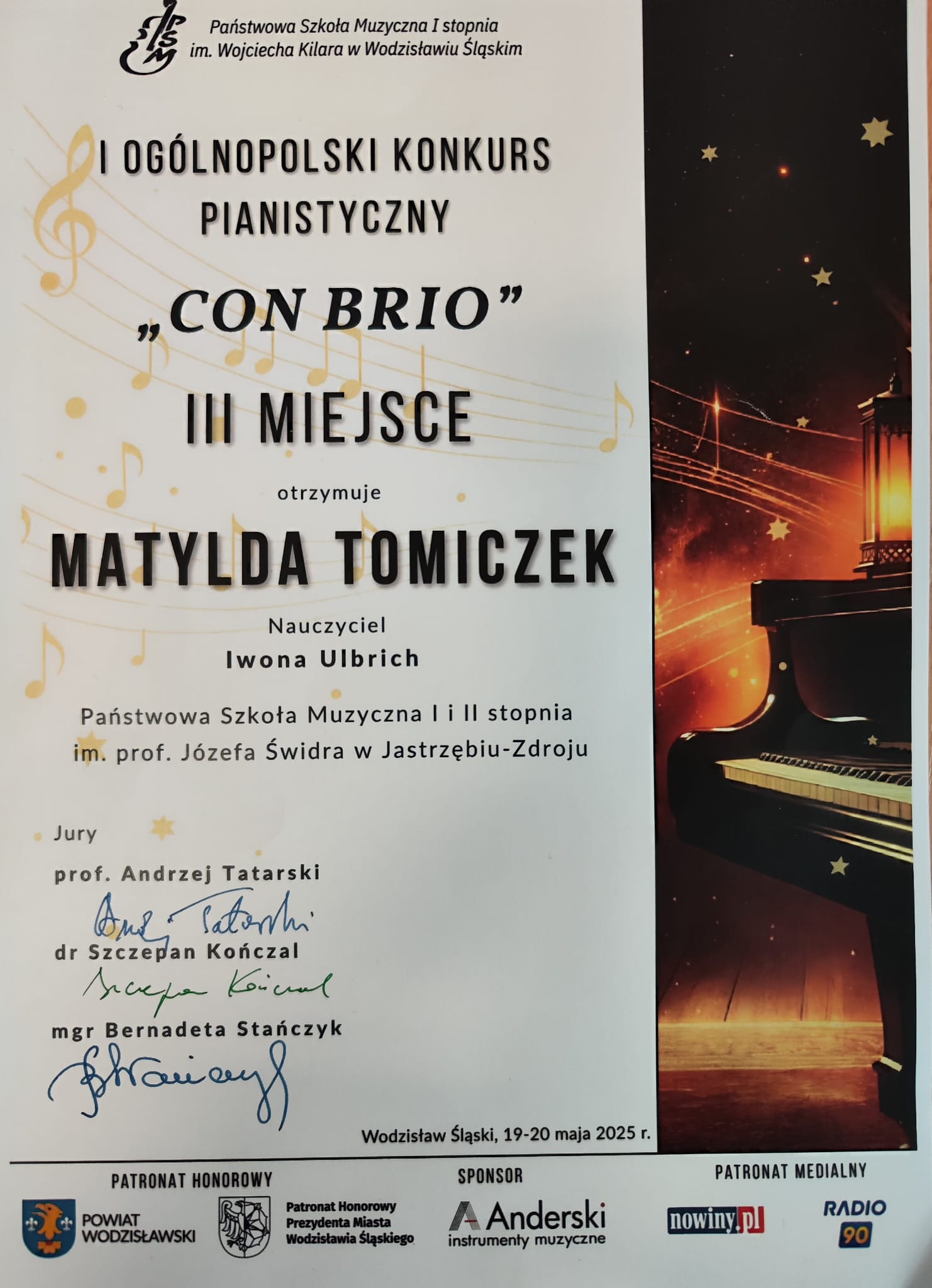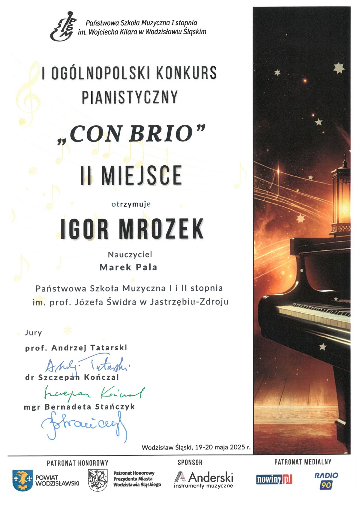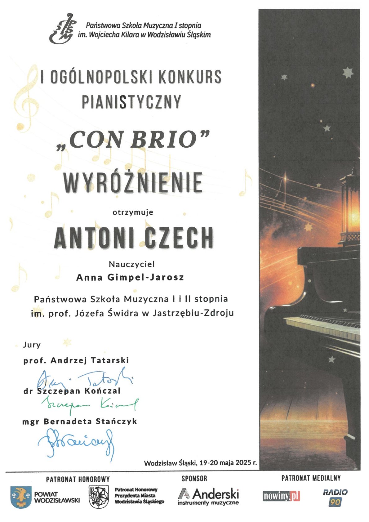 - I Ogólnopolski Konkurs Pianistyczny „CON BRIO”, Wodzisław Śląski, 19-20.05.2025 r.