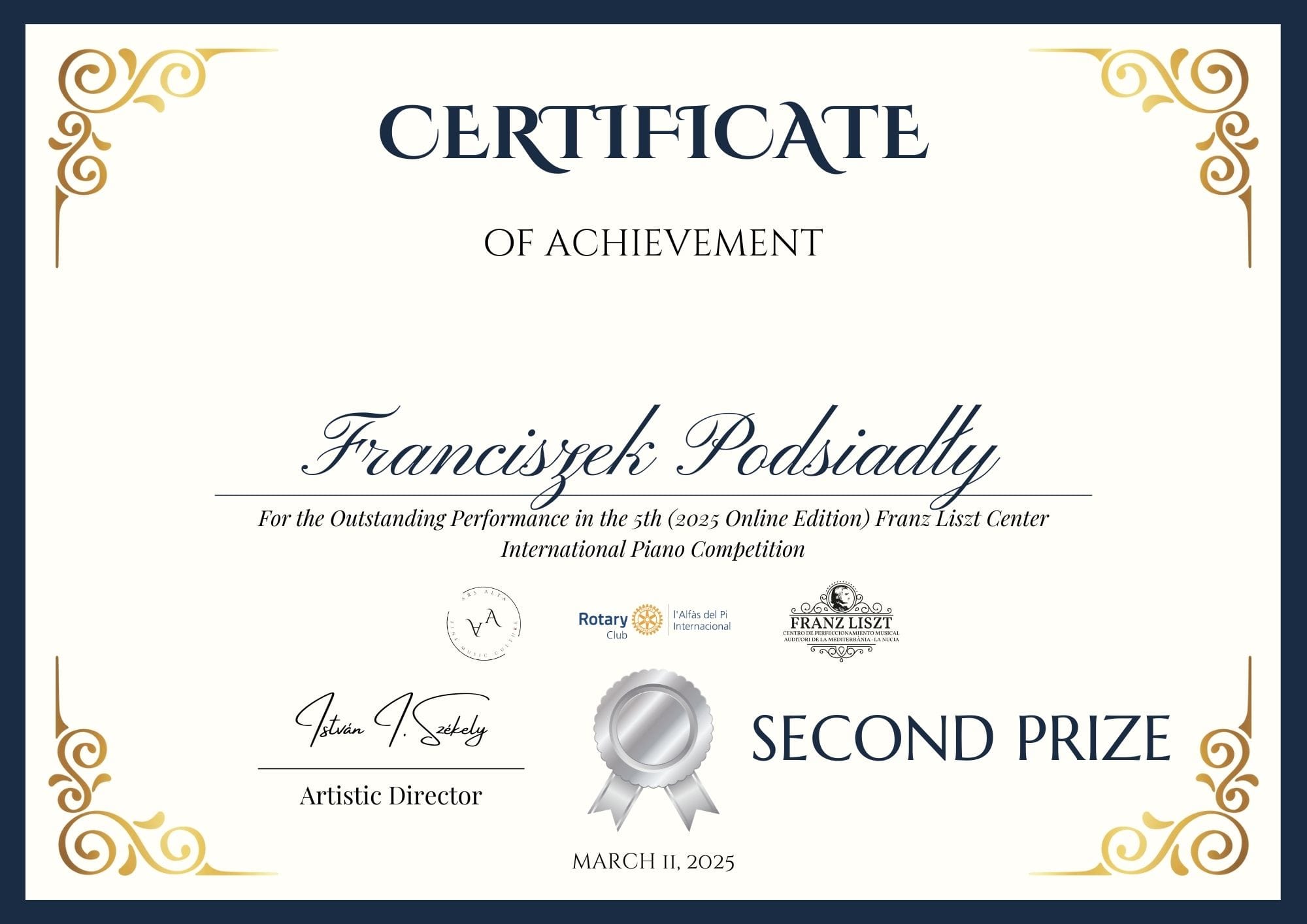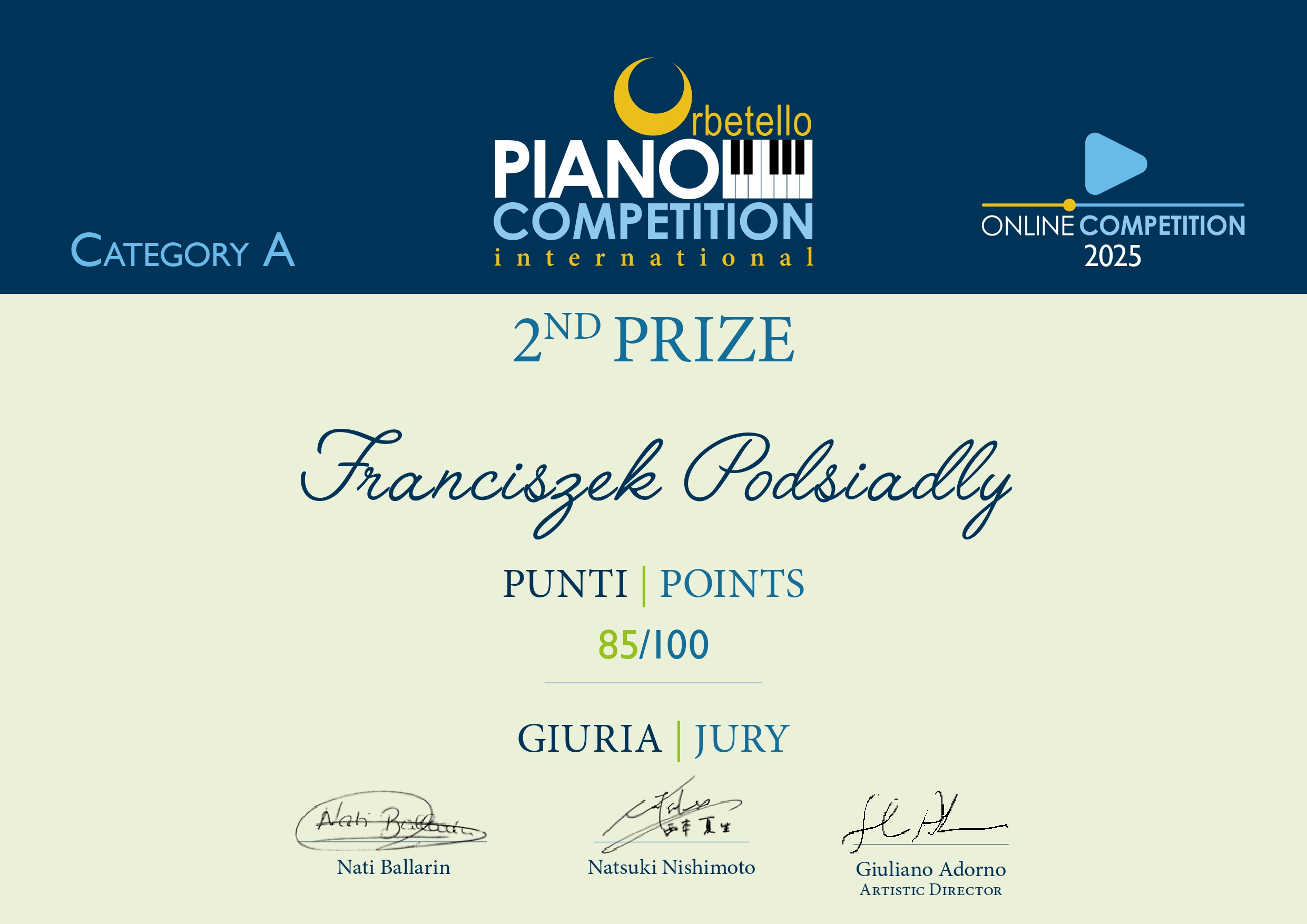 - Międzynarodowy Konkurs Pianistyczny „Orbetello”, Włochy, maj 2025 r. – edycja online
