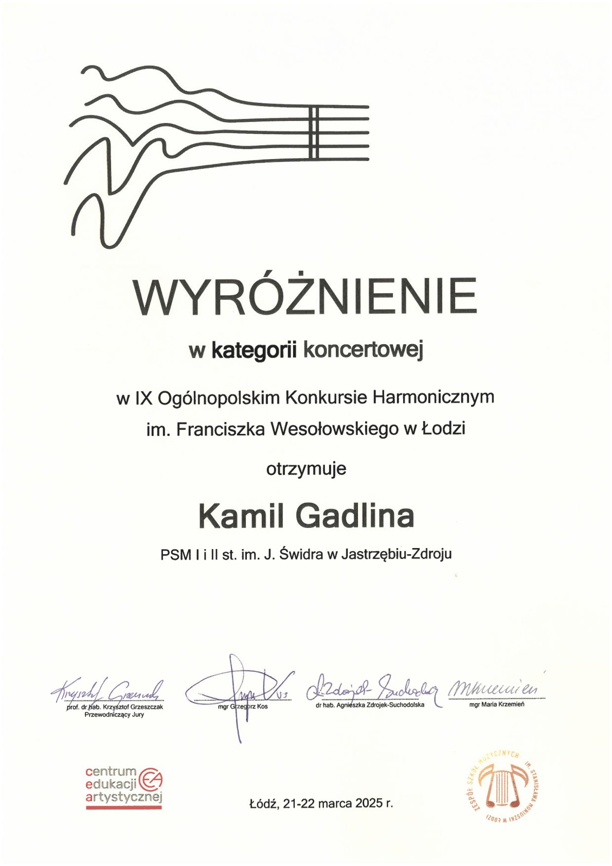 - IX Ogólnopolski Konkurs Harmoniczny im. Franciszka Wesołowskiego w Łodzi, 21-22.03.2025 r.