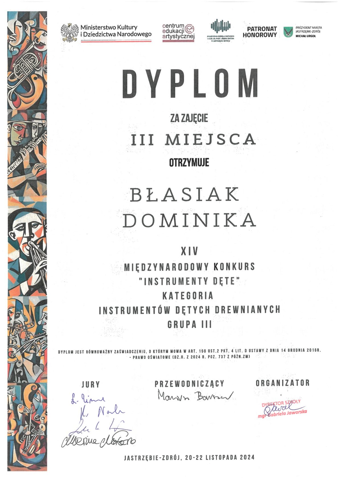 - III MIEJSCE – DOMINIKA BŁASIAK z klasy saksofonu mgra Łucjana Brzozy – kategoria: Instrumenty dęte drewniane, grupa III