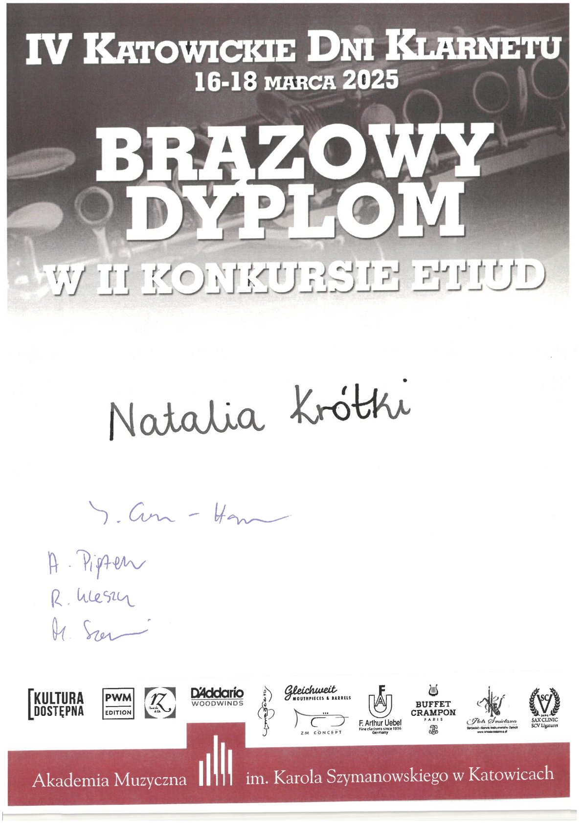 - BRĄZ – NATALIA KRÓTKI z klasy klarnetu mgra Piotra Śmietany