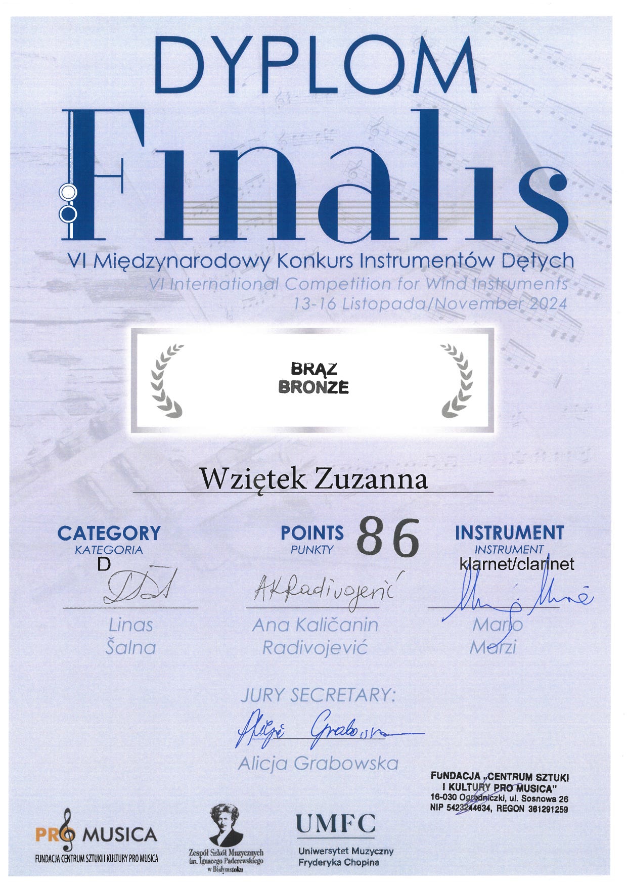 - BRĄZ – ZUZANNA WZIĘTEK z klasy klarnetu mgra Piotra Śmietany – kategoria D