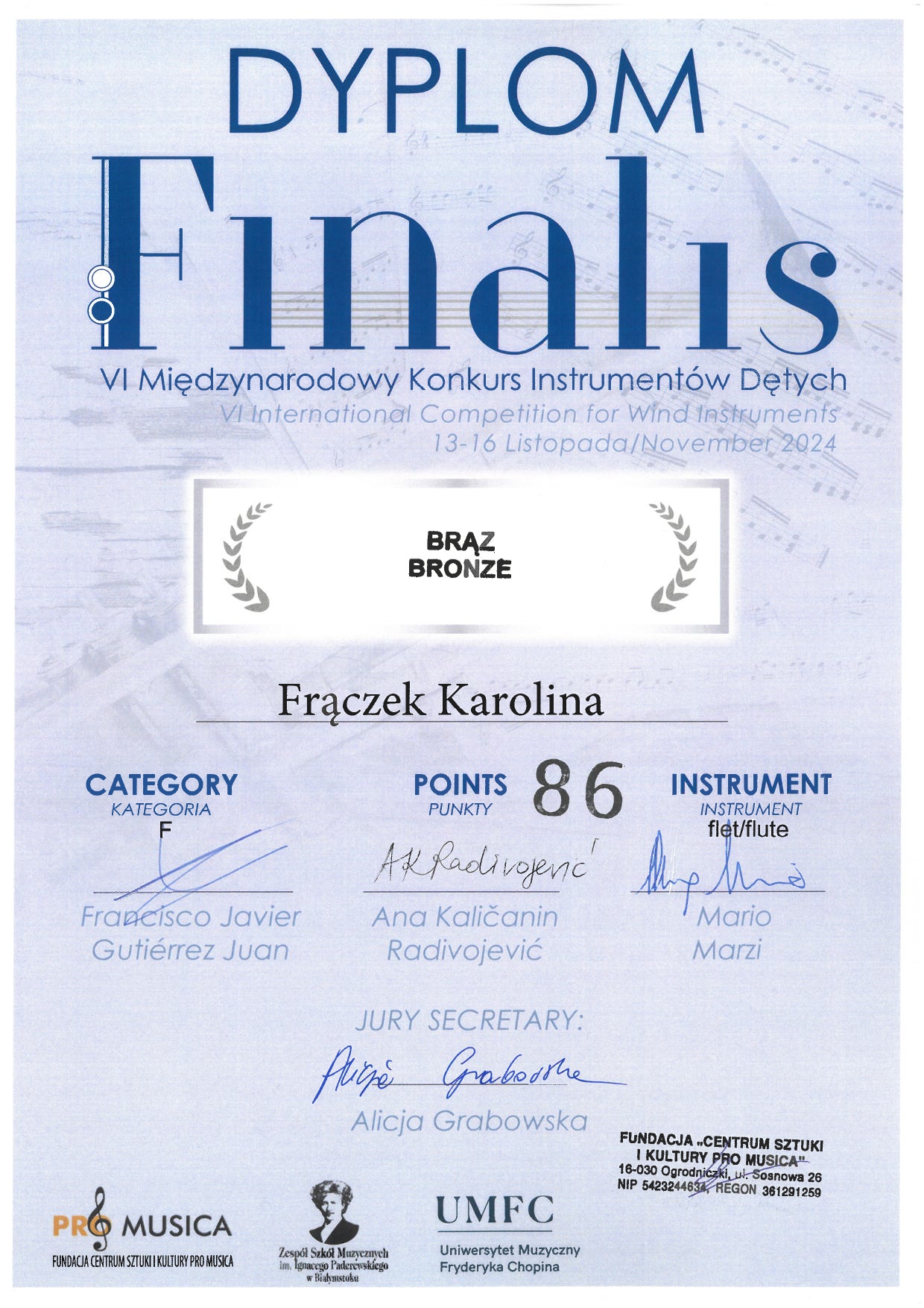 - BRĄZ – KAROLINA FRĄCZEK z klasy fletu mgr Darii Branny – kategoria F