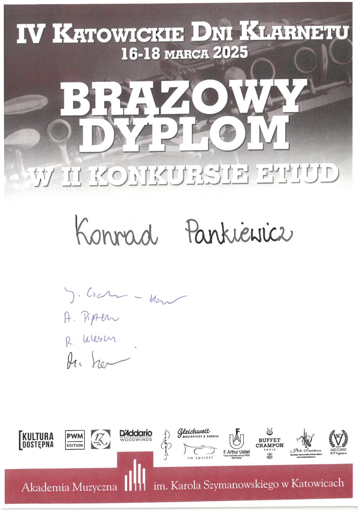 - BRĄZ – KONRAD PANKIEWICZ z klasy klarnetu mgra Piotra Śmietany