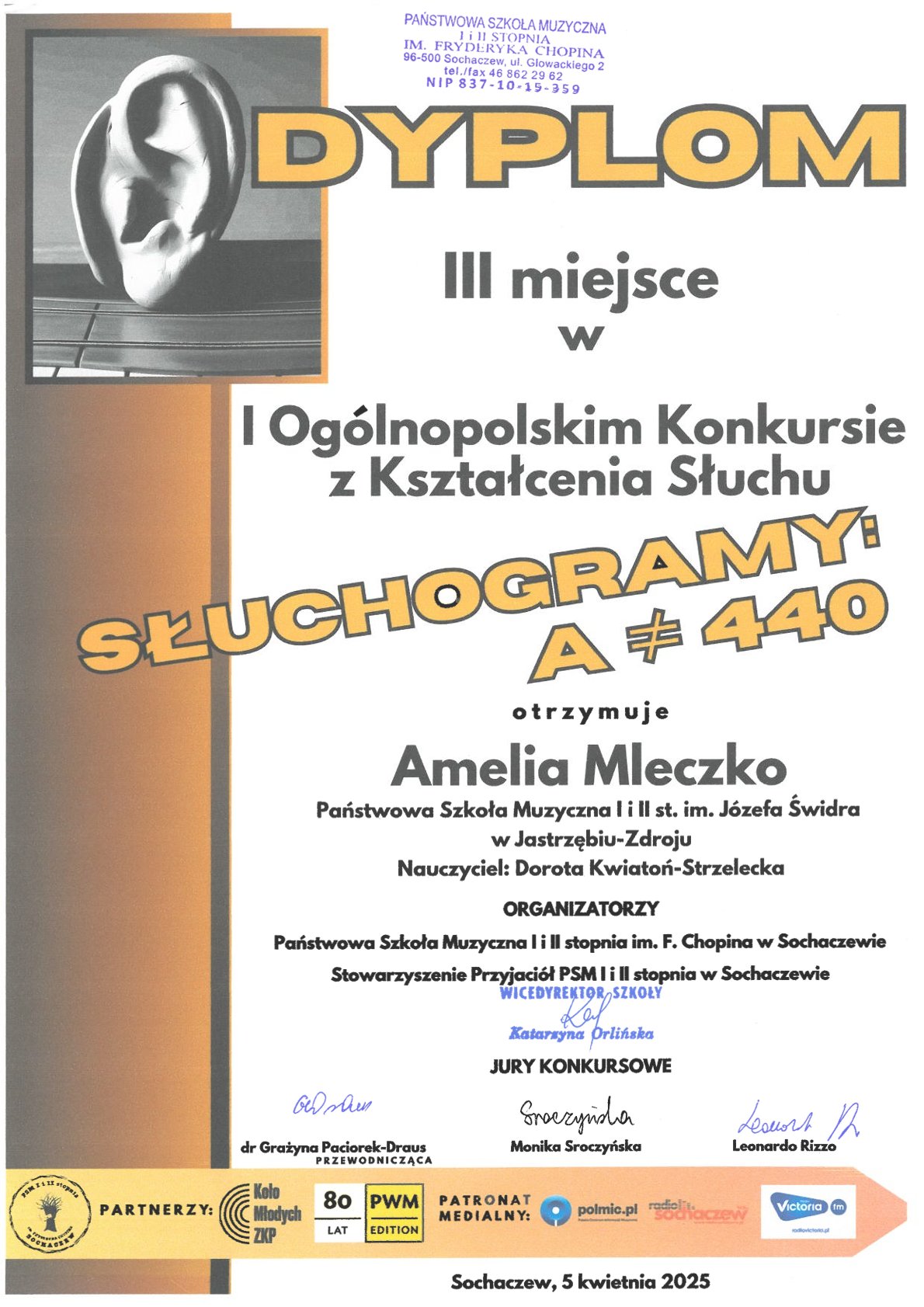 - I Ogólnopolski Konkurs z Kształcenia Słuchu „Słuchogramy”, Sochaczew, 5.04.2025 r.