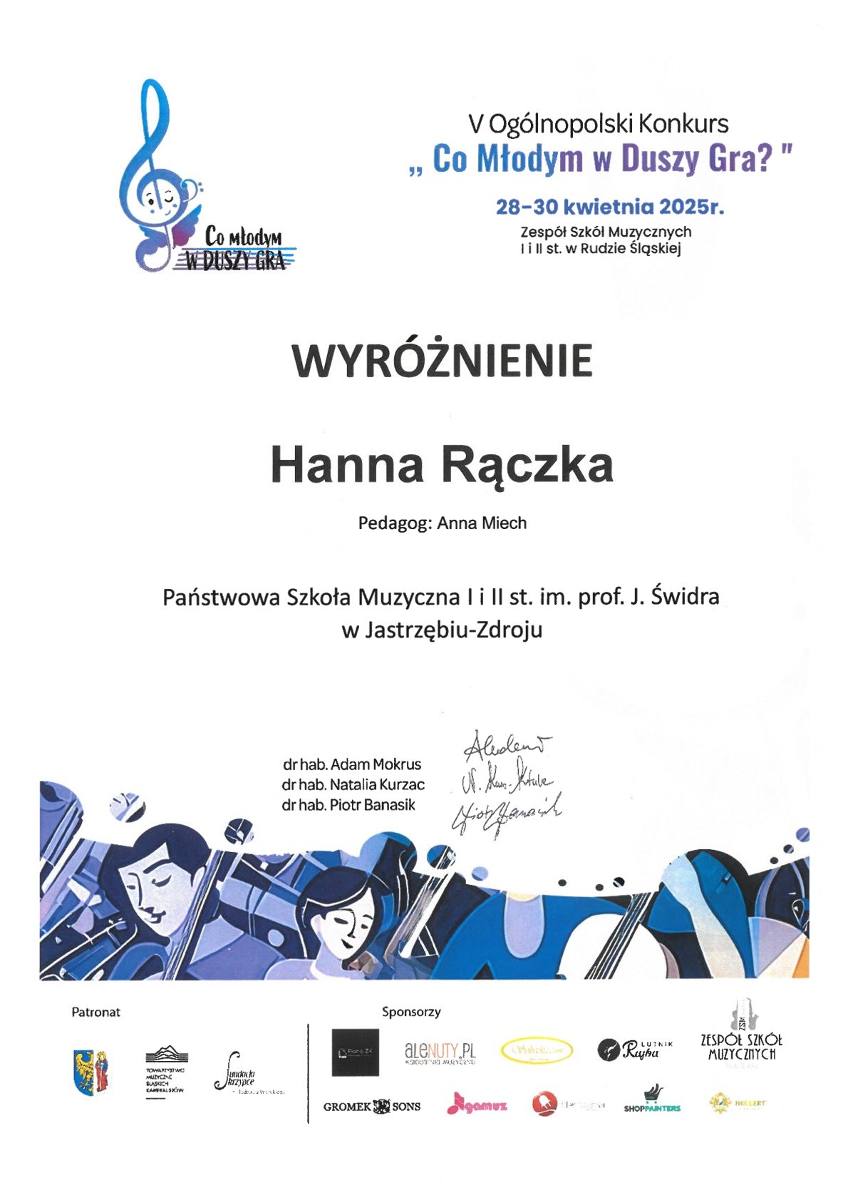 - WYRÓŻNIENIE – HANNA RĄCZKA z klasy fortepianu dr hab. Anny Miech