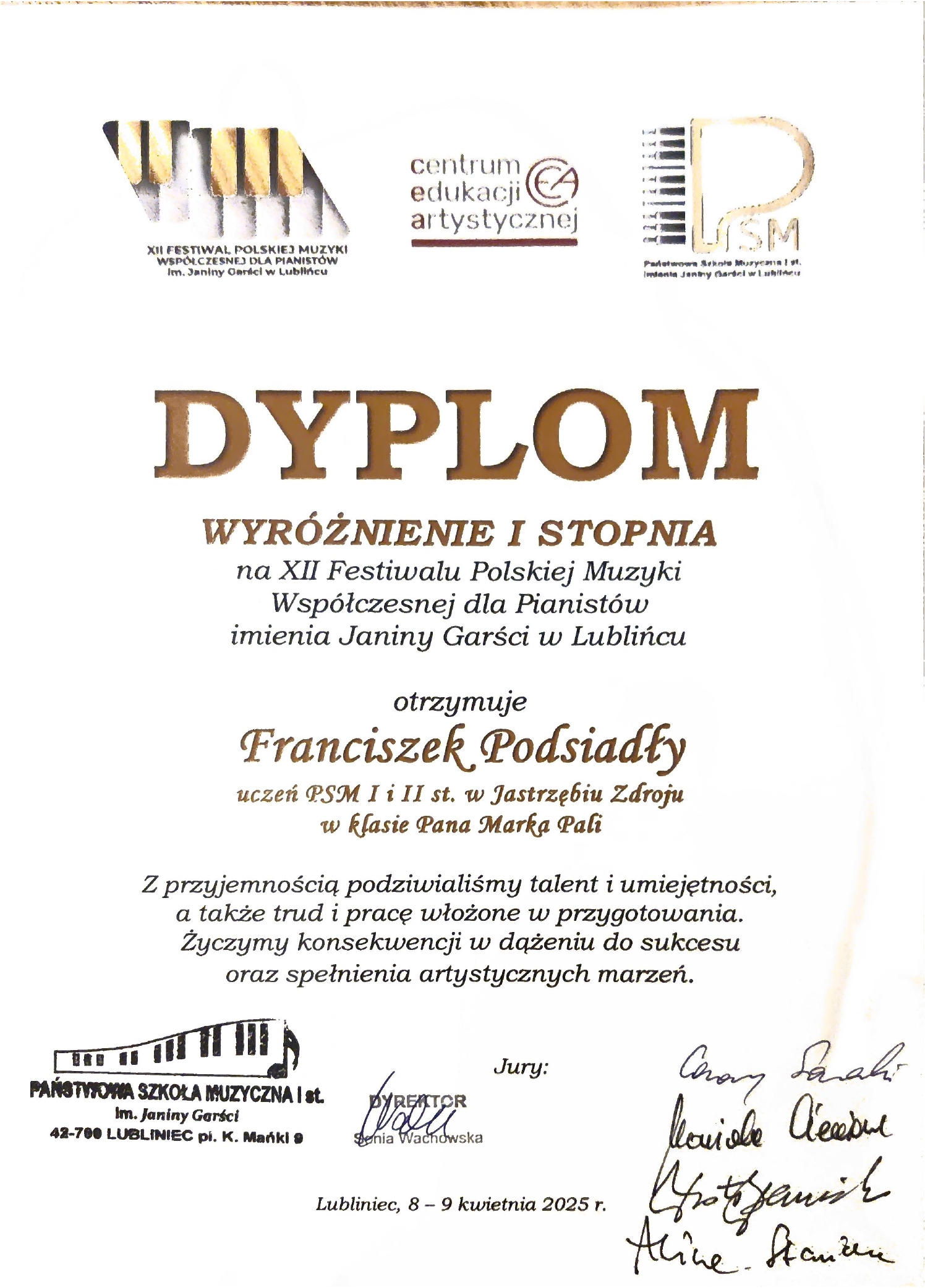 - WYRÓŻNIENIE I st. – FRANCISZEK PODSIADŁY z klasy fortepianu mgra Marka Pali