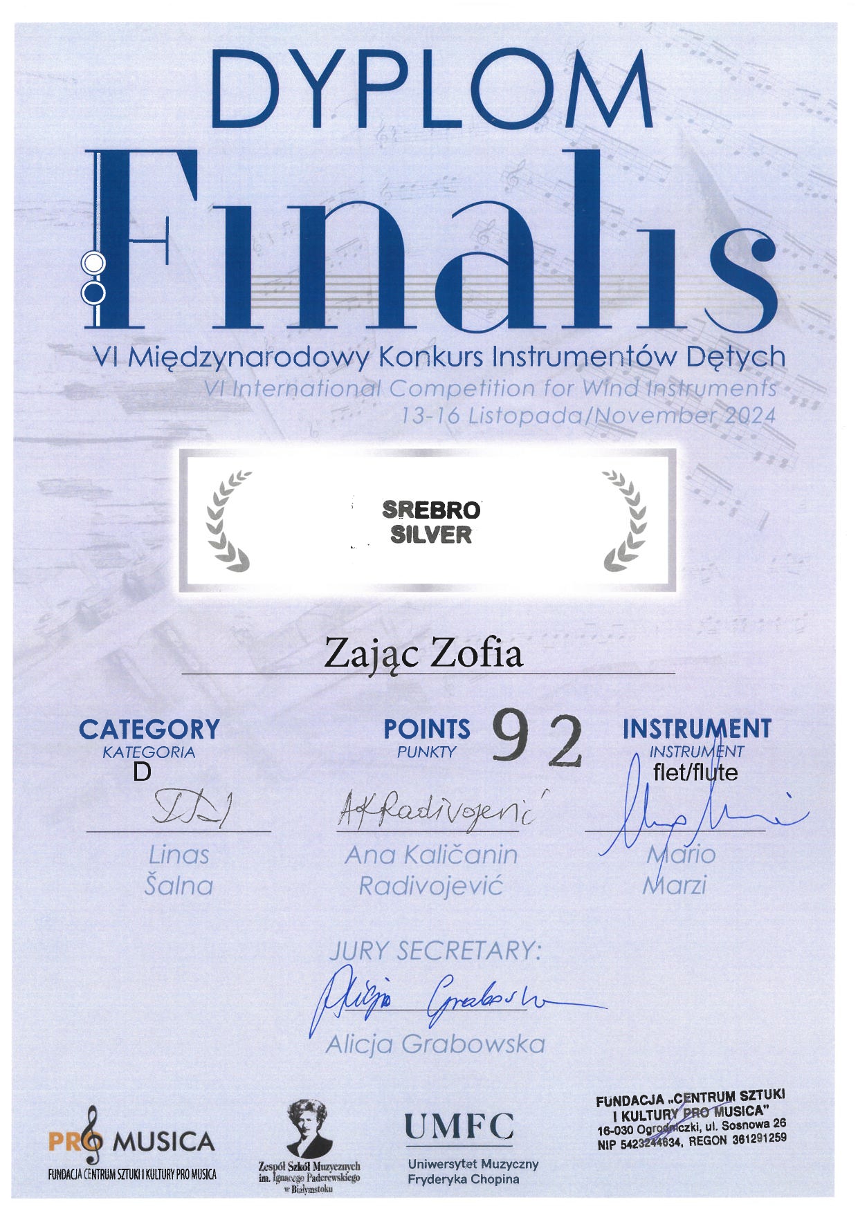 - SREBRO – ZOFIA ZAJĄC z klasy fletu mgr Darii Branny – kategoria D