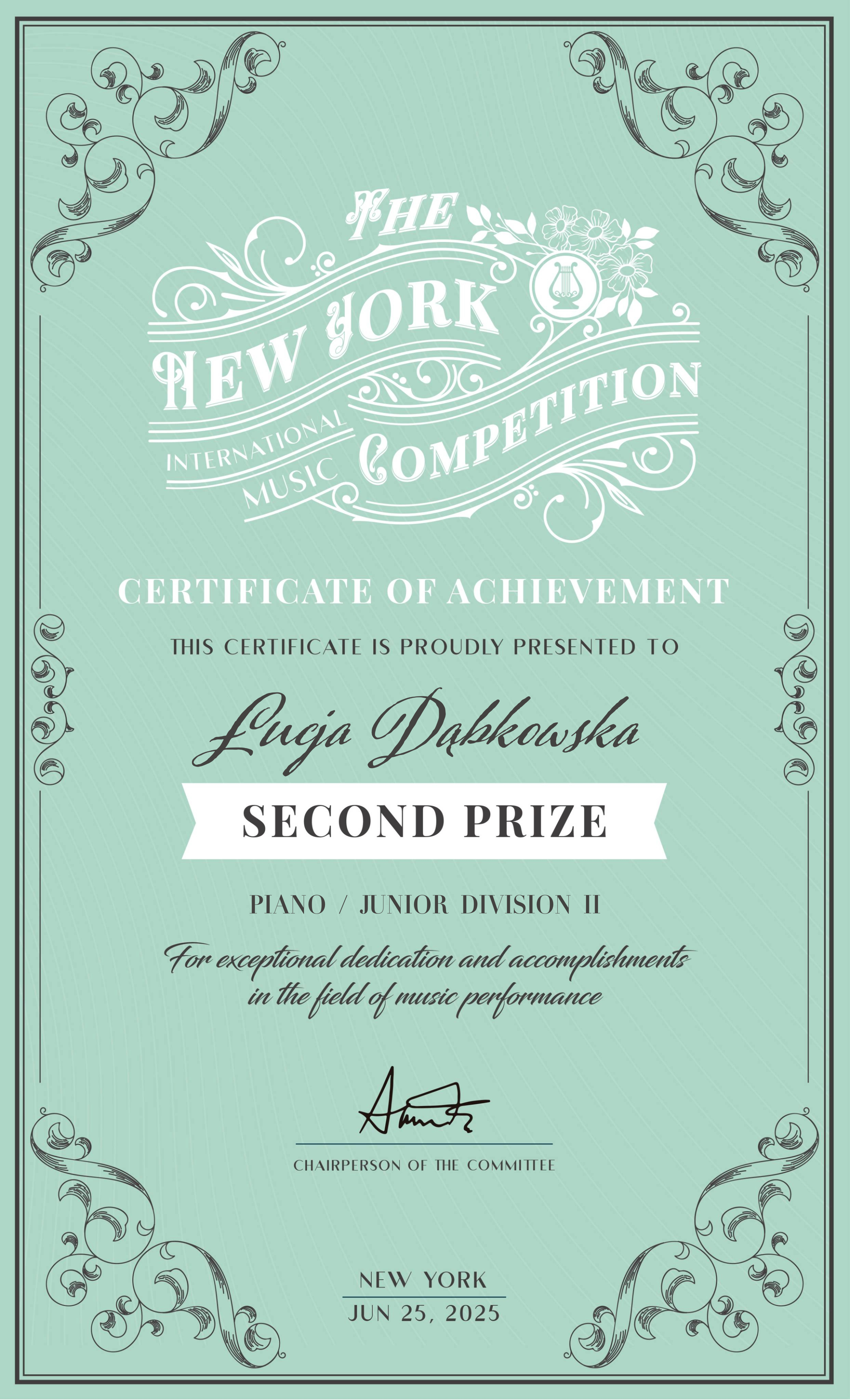 - Międzynarodowy Konkurs Muzyczny, Nowy Jork, czerwiec 2025, edycja online