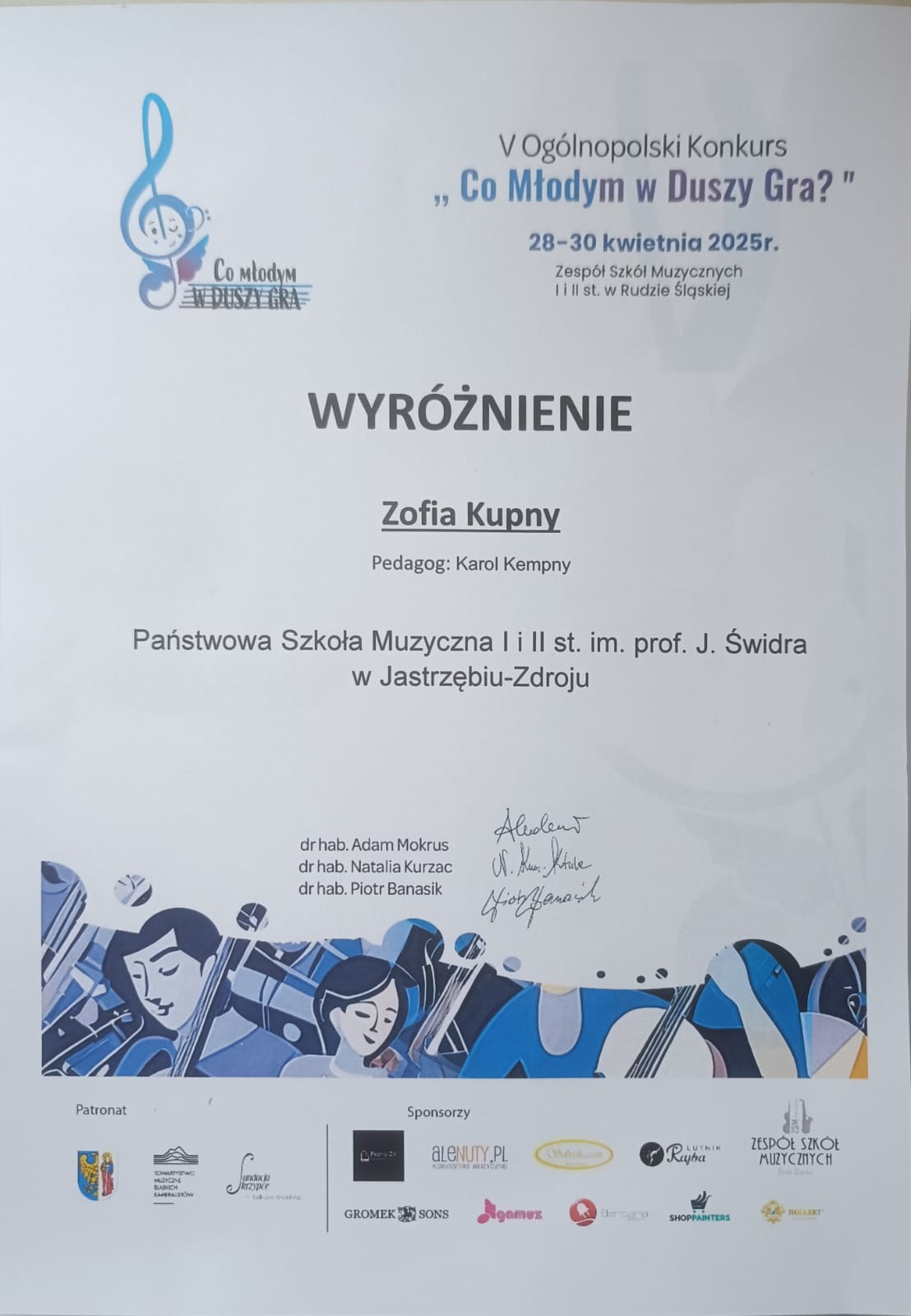 - WYRÓŻNIENIE – ZOFIA KUPNY z klasy skrzypiec mgra Karola Kempnego – grupa I