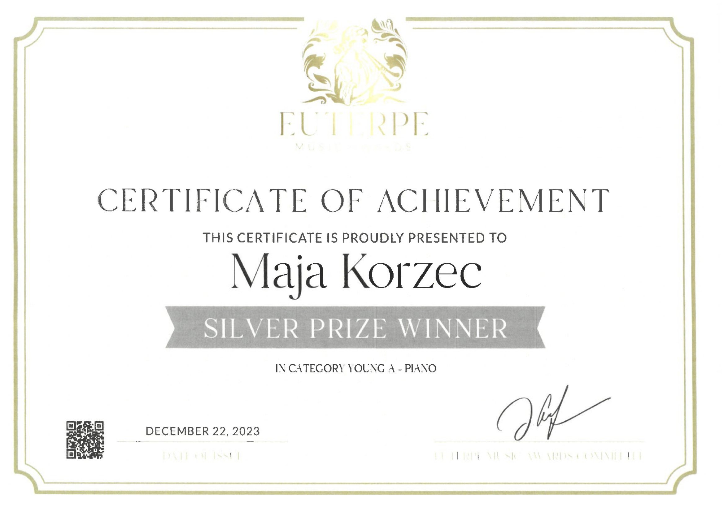 Srebrna Nagroda dla Mai Korzec w Międzynarodowym Konkursie Muzycznym EUTERPE MUSIC AWARDS w Berlinie