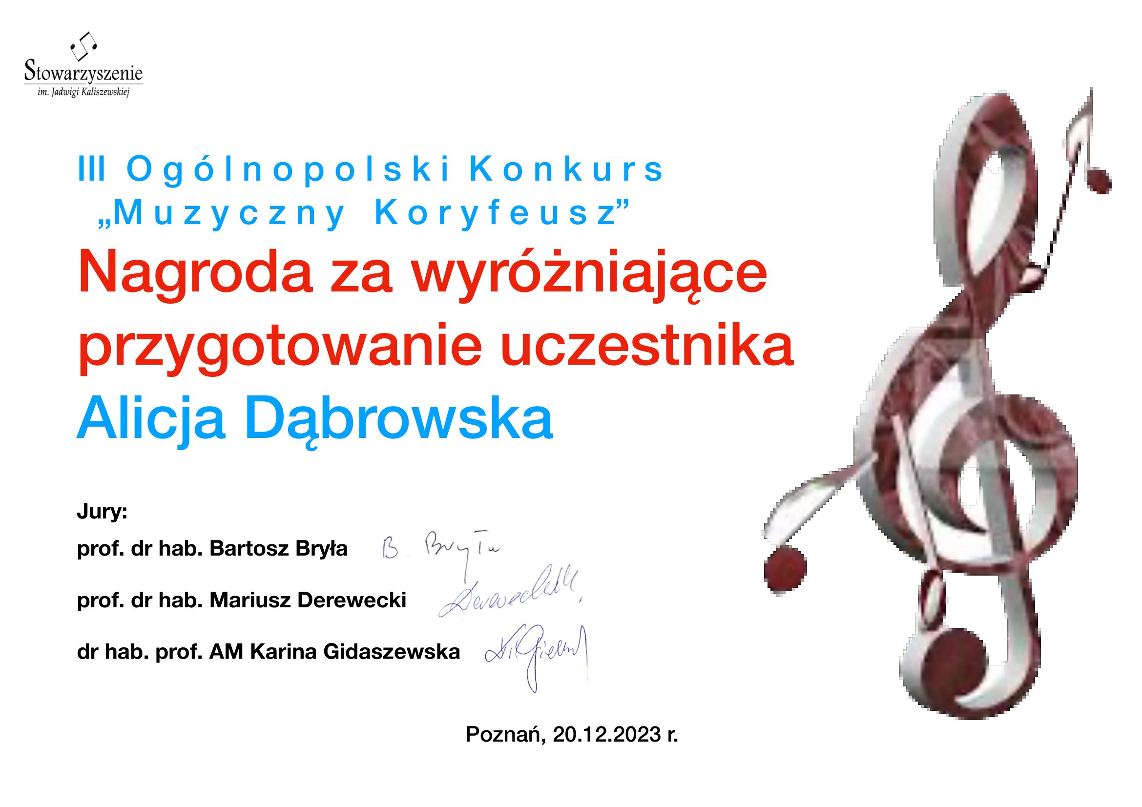 Pani Alicja Dąbrowska otrzymała nagrodę za wyróżniające przegotowanie uczestnika do konkursu.