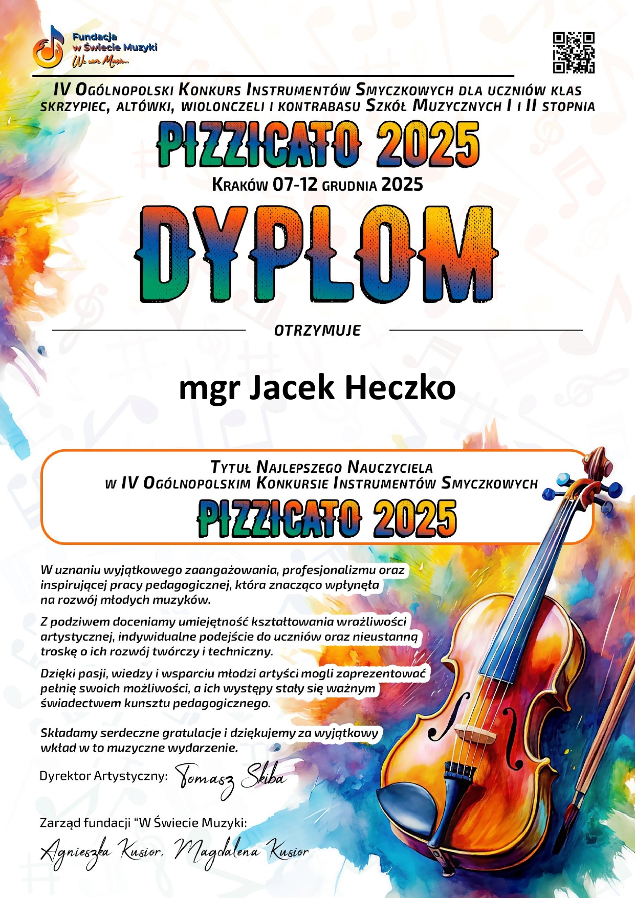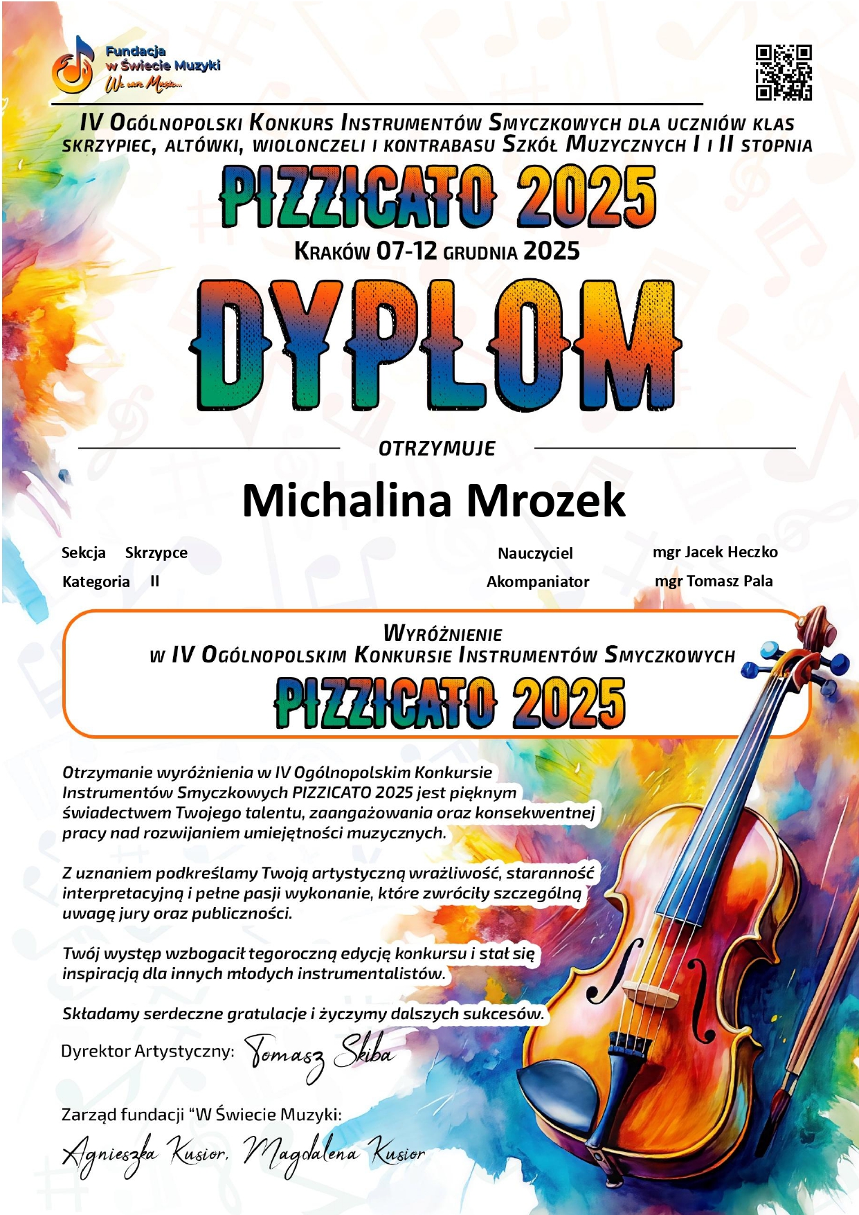 Dwie młode skrzypaczki, uczennice Pana Jacka Heczko zdobyły WYRÓŻNIENIE w IV Ogólnopolskim Konkursie Instrumentów Smyczkowych dla klas skrzypiec, altówki, wiolonczeli i kontrabasu szkół muzycznych I i II st. PIZZICATO 2025.