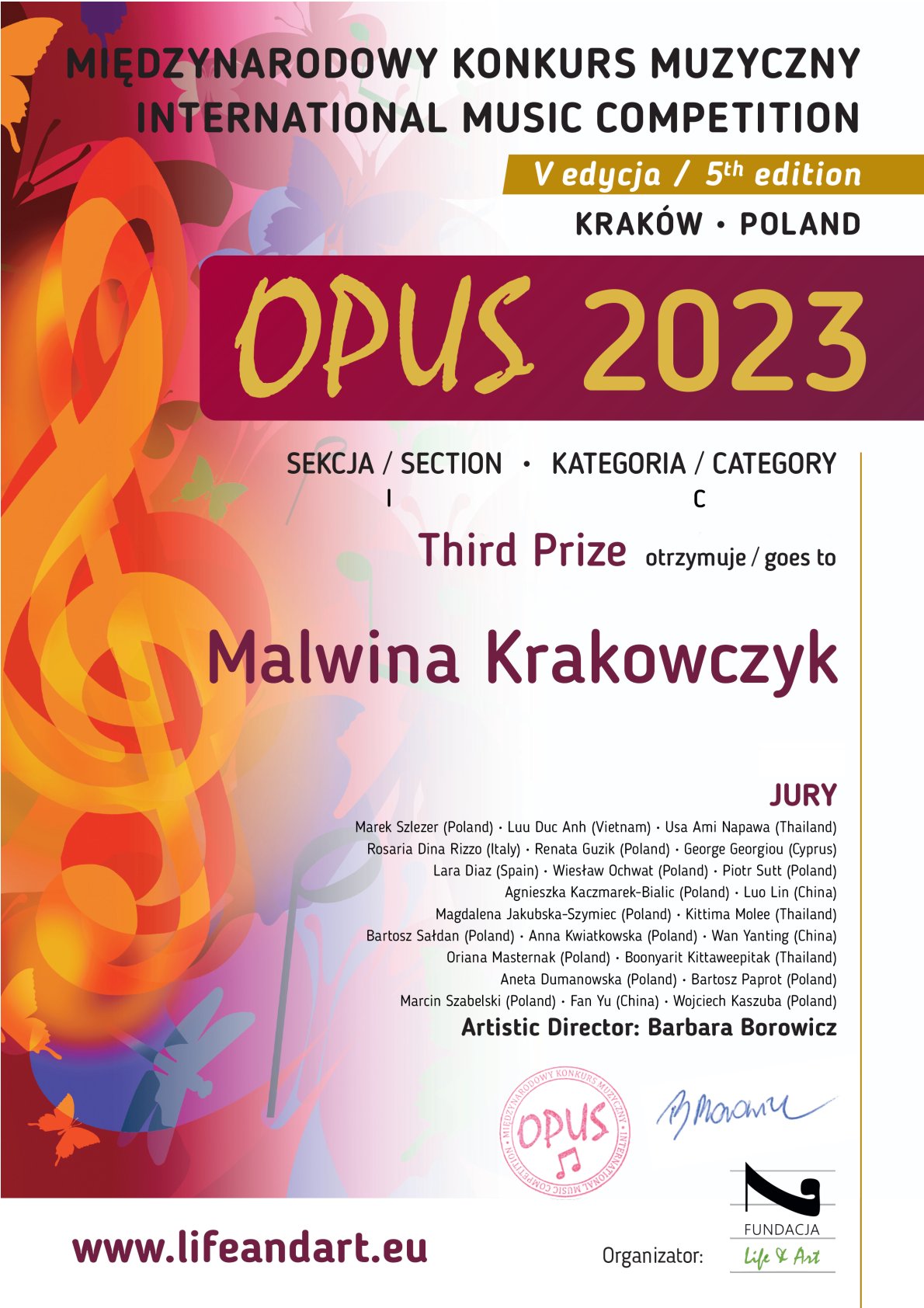 II NAGRODA – JAŚMINA ŚWISTAK z klasy dr hab. Anny Miech – kategoria A