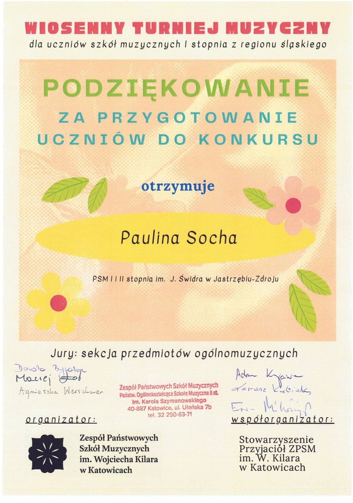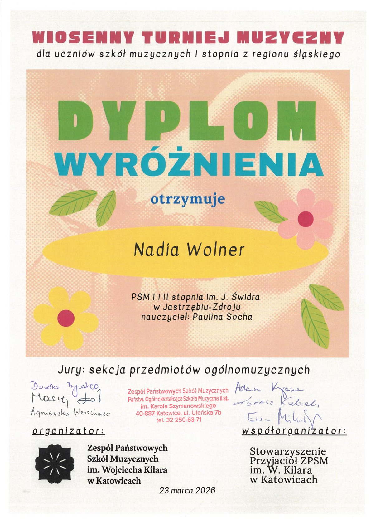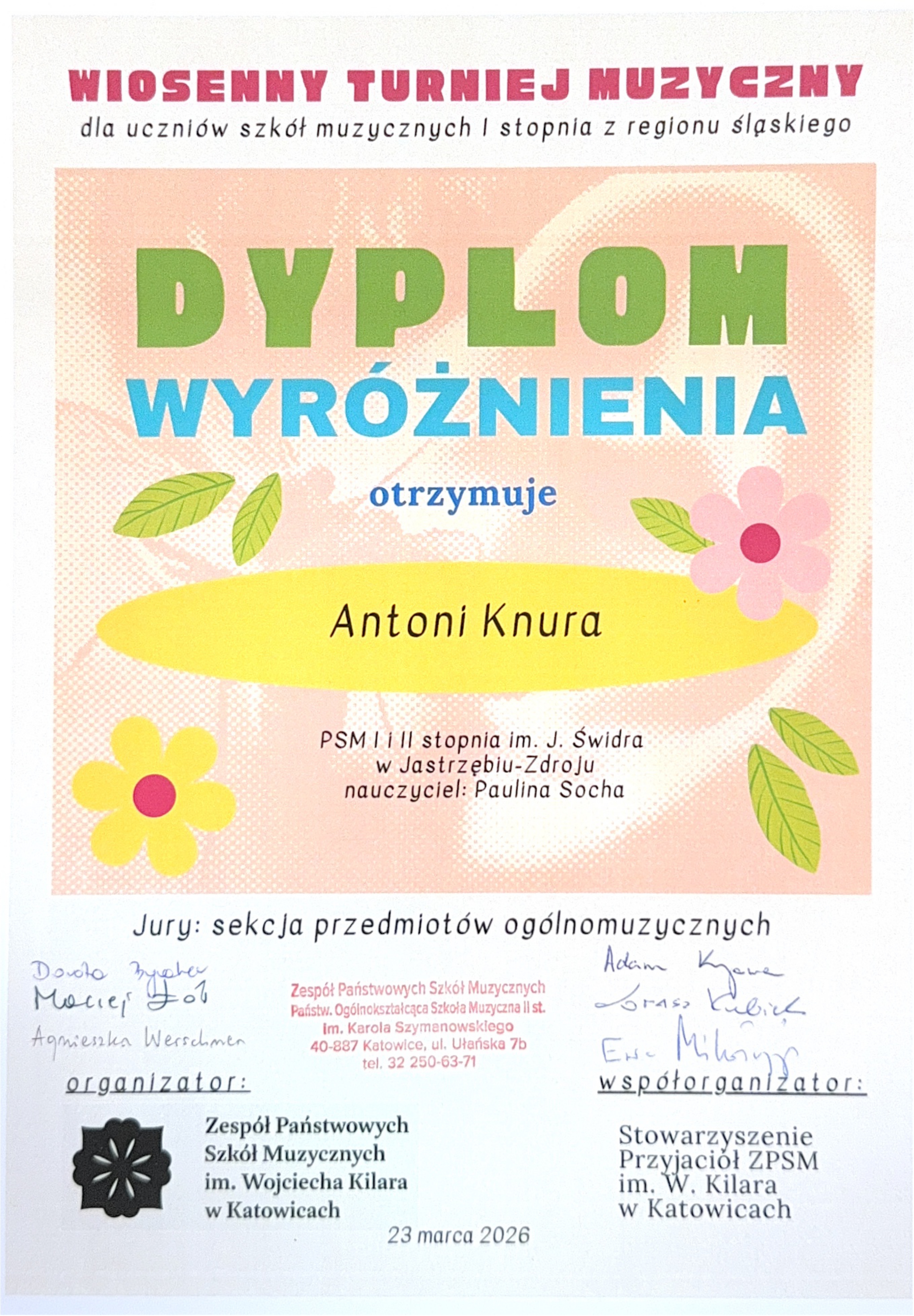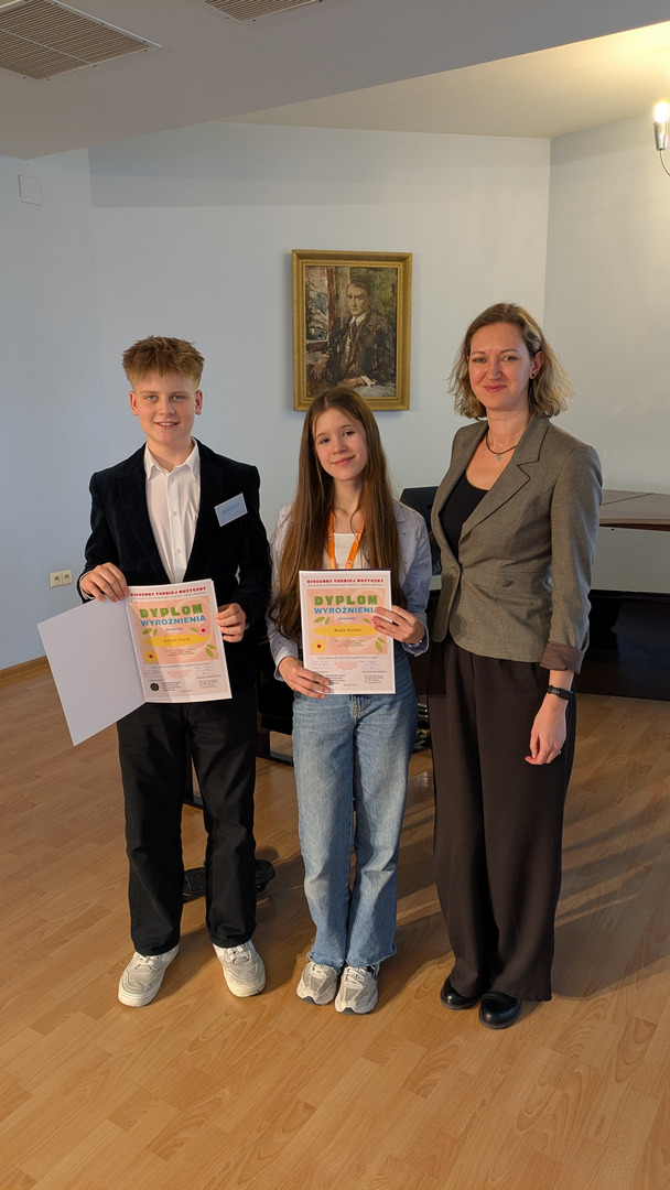 23 marca 2026 r. NADIA WOLNER i ANTONI KNURA z klasy Pani Pauliny Sochy, jako dwuosobowa drużyna, wzięli udział w Wiosennym Turnieju Muzycznym zorganizowanym przez ZPSM - Państwowa Ogólnokształcąca Szkoła Muzyczna II st. w Katowicach dla uczniów szkół muzycznych I stopnia regionu śląskiego i zdobyli WYRÓŻNIENIE.