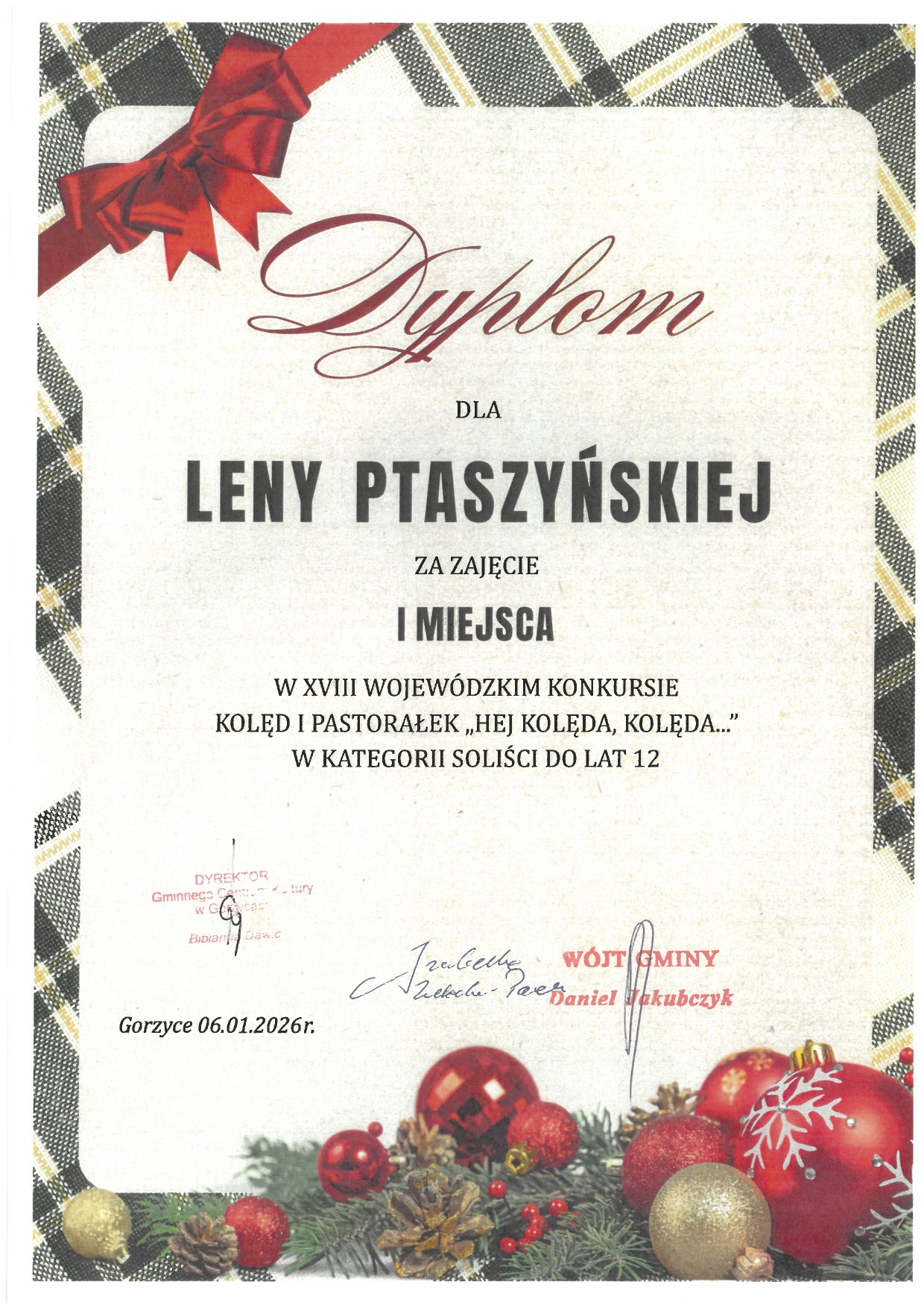 I MIEJSCE w XVIII Wojewódzkim Konkursie Kolęd i Pastorałek "Hej Kolęda, Kolęda..." w Gorzycach.