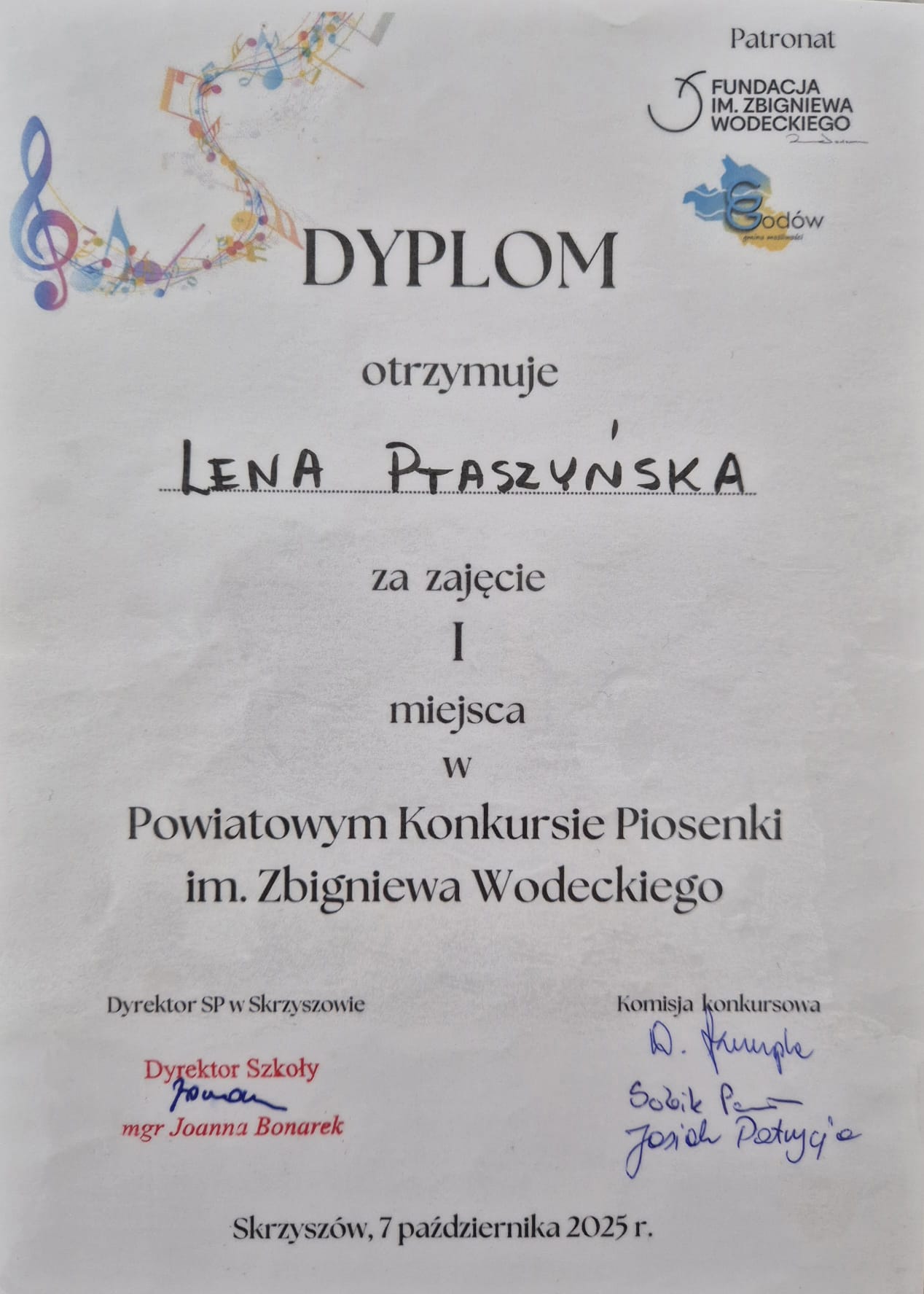I MIEJSCE w Powiatowym Konkursie Piosenki im. Zbigniewa Wodeckiego w Skrzyszowie.