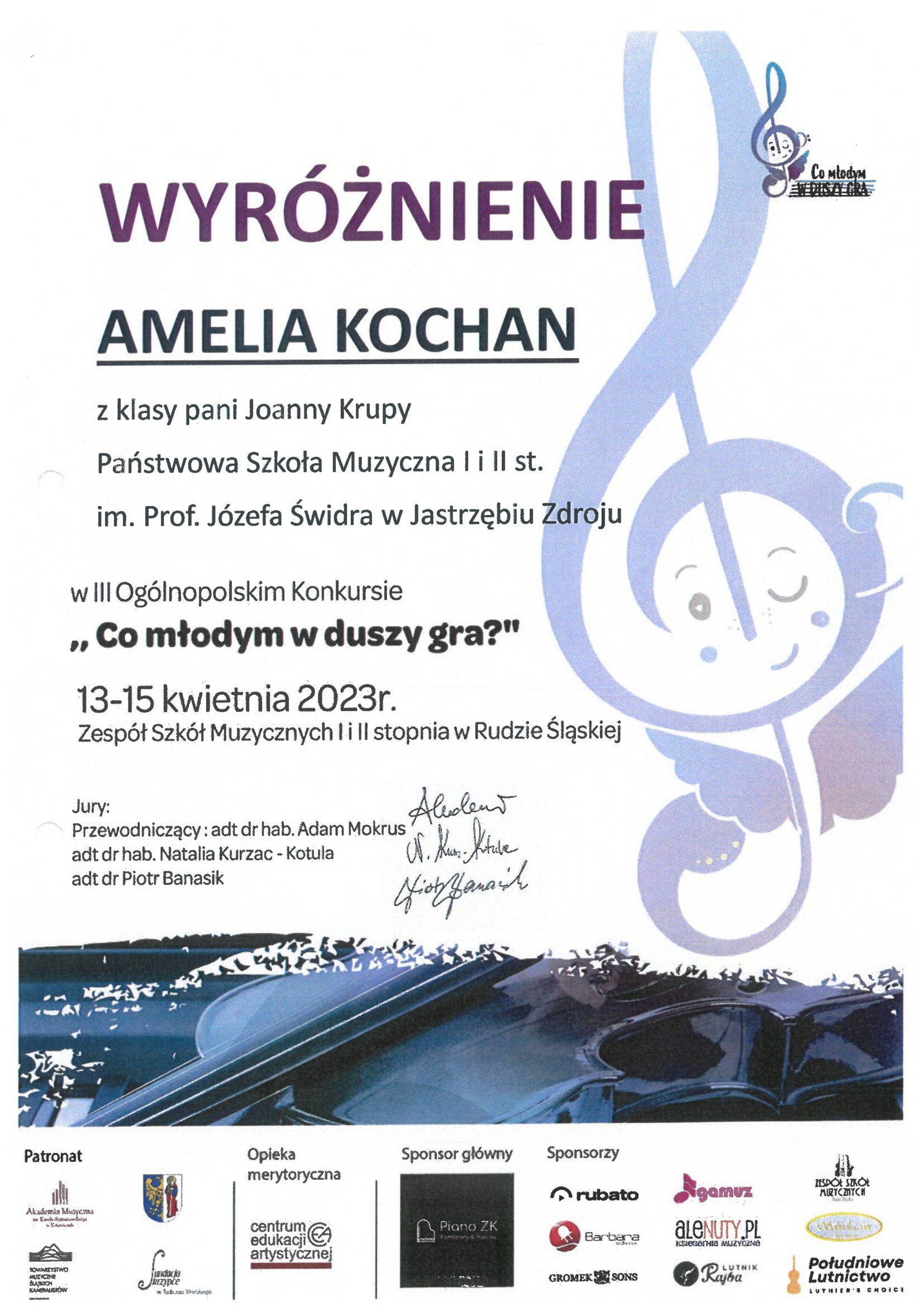 Nasza bardzo młoda pianistka Amelka Kochan, pierwszoklasistka w cyklu c6, z klasy Pani Joanny Krupy zdobyła wyróżnienie w III Ogólnopolskim Konkursie "Co młodym w duszy gra?", który odbył się w dniach 13-15 kwietnia 2023 r. w Rudzie Śląskiej.