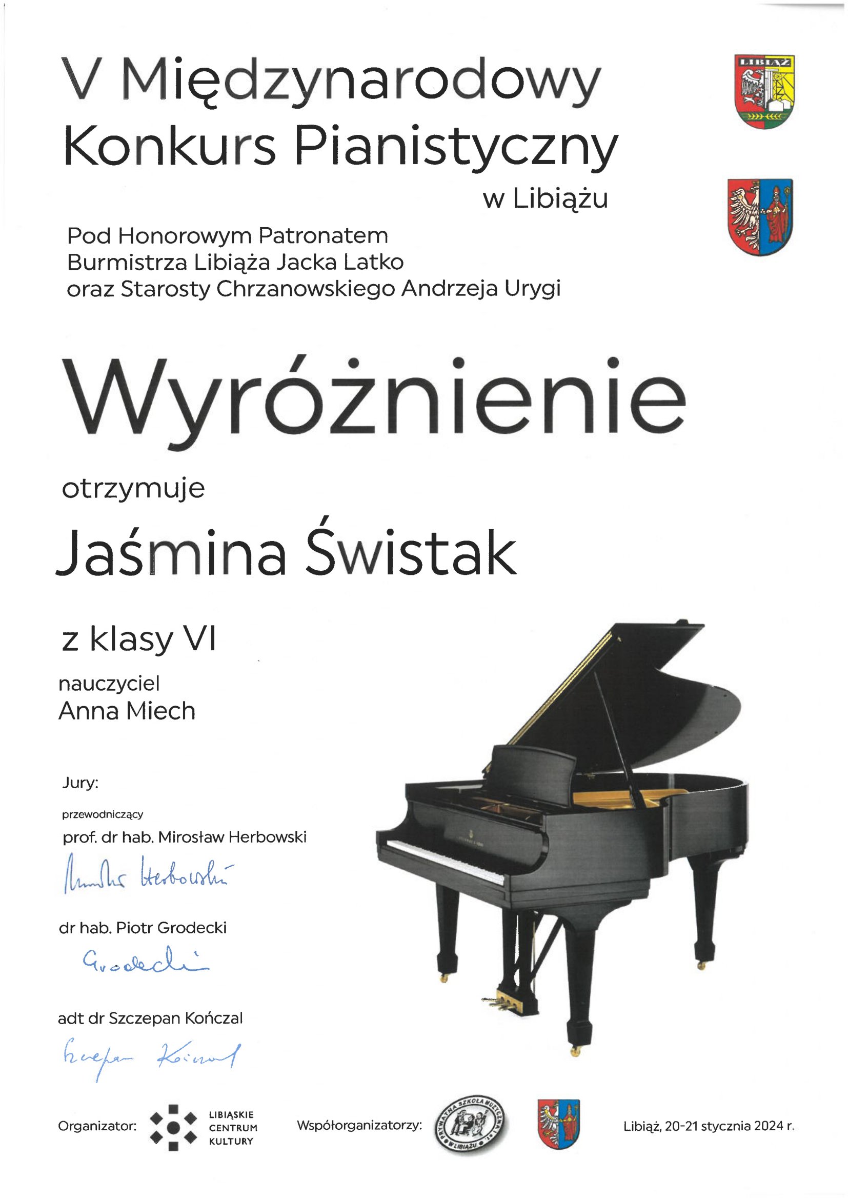 JAŚMINA ŚWISTAK z klasy fortepianu Pani Anny Miech otrzymała wyróżnienie w V Międzynarodowym Konkursie Pianistycznym w Libiążu, który odbył się w dniach 20-21 stycznia 2024 r.