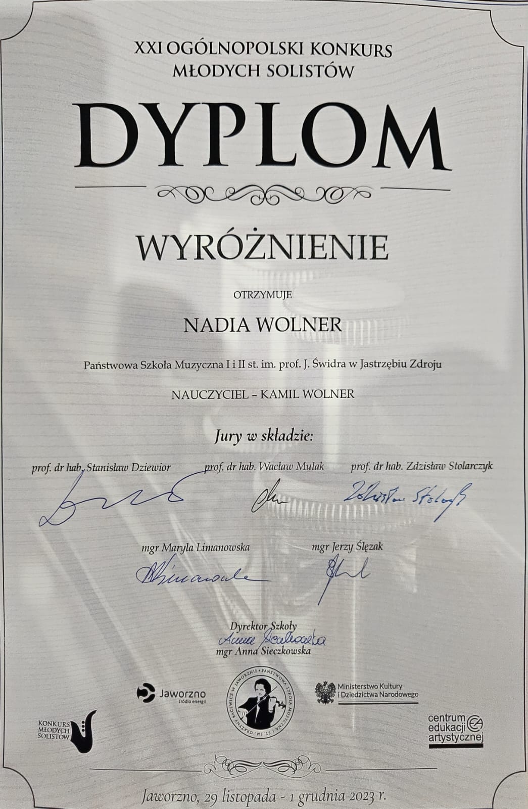 Wyróżnienie dla Nadii Wolner w XXI Ogólnopolskim Konkursie Młodych Solistów w Jaworznie