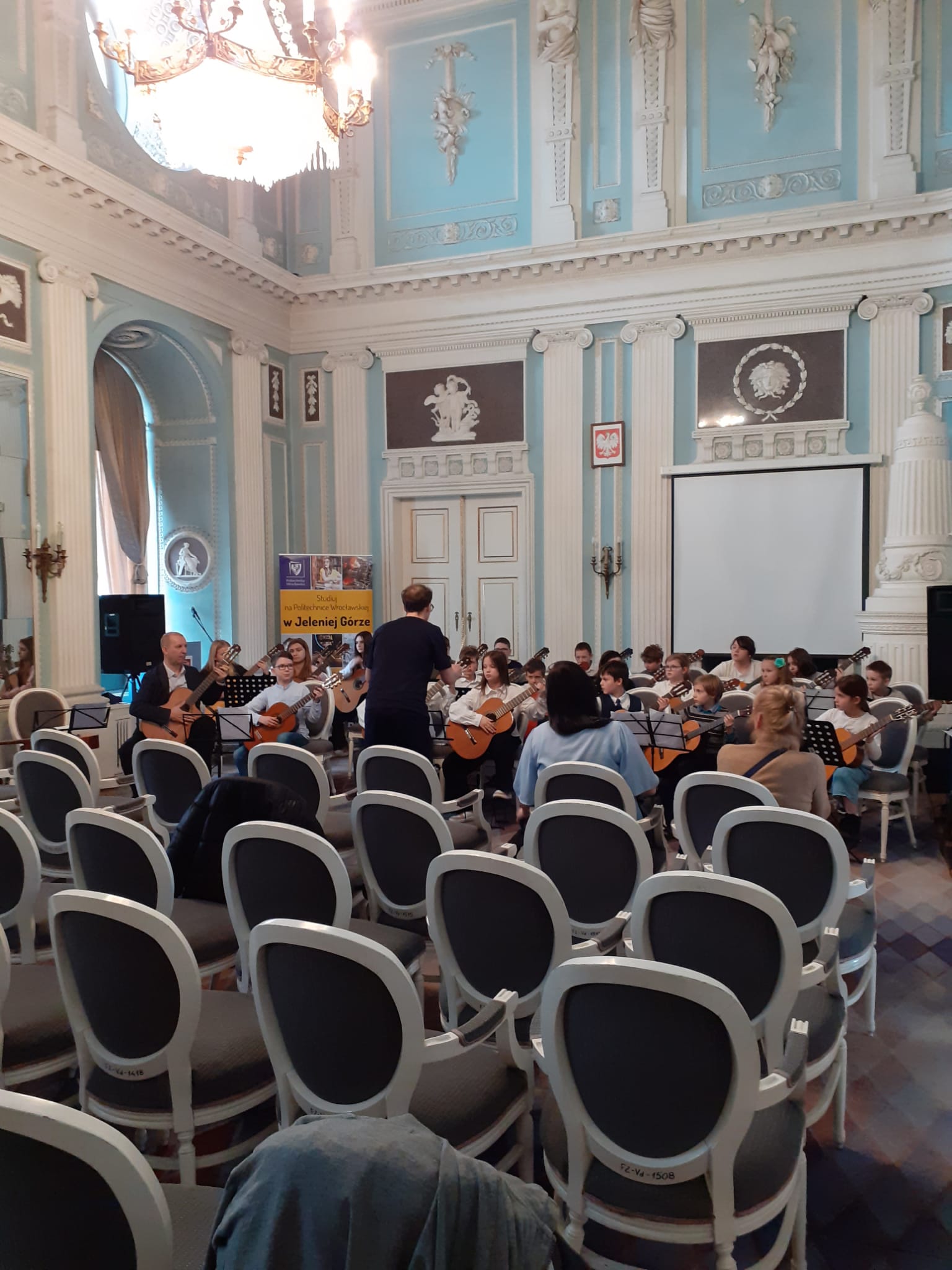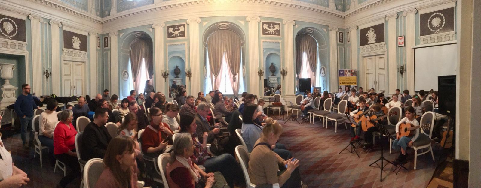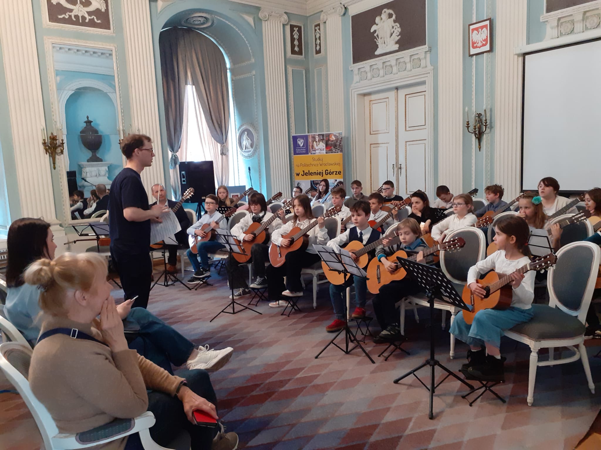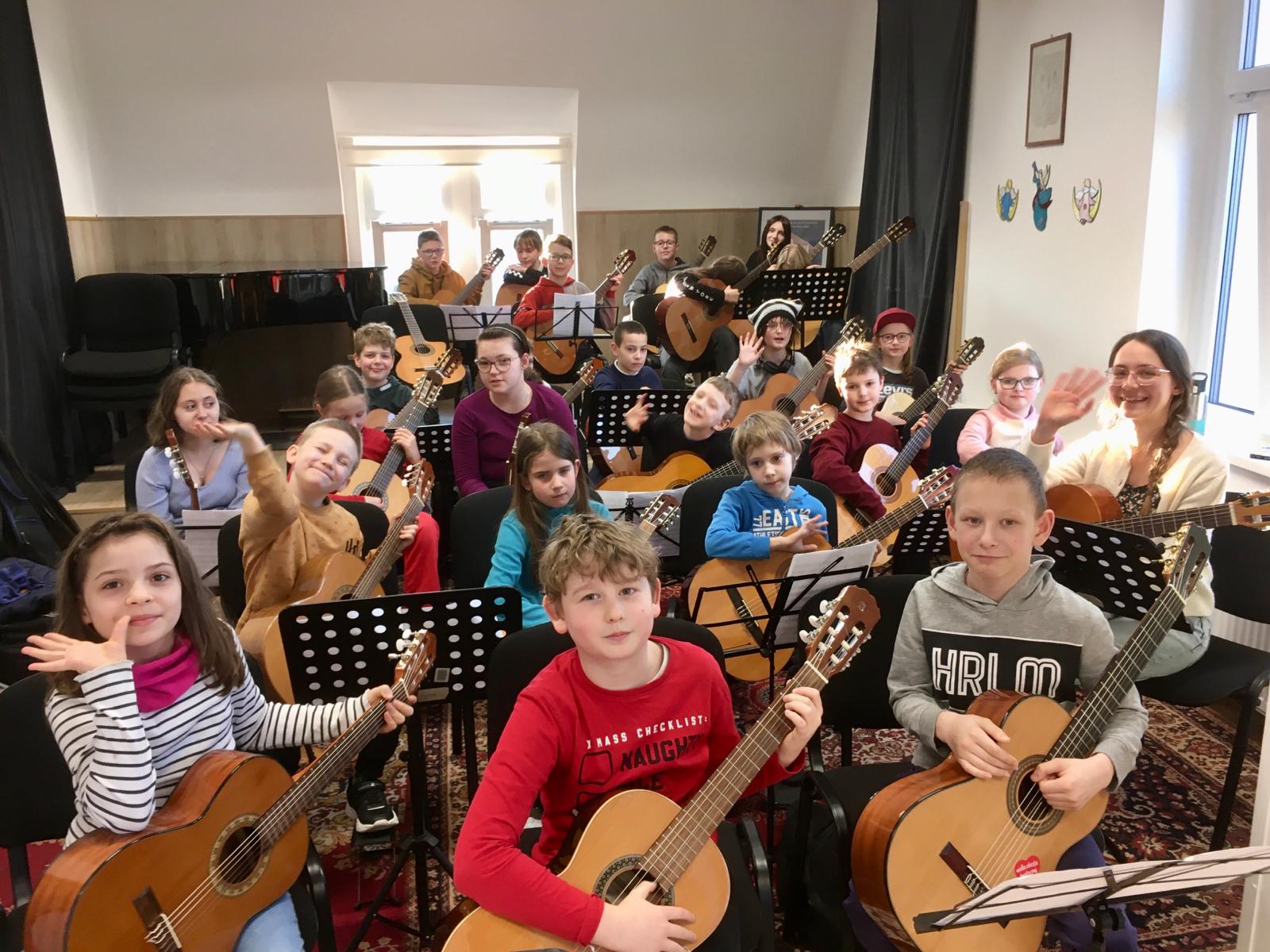 26 marca 2024 roku w naszej szkole po raz pierwszy w historii odbył się Dzień Gitarowicza.Przygotowania zaczęliśmy już tydzień wcześniej od próby orkiestry gitarowej. Nasze święto gitary rozpoczęliśmy wykładami w auli PSM w Cieplicach. Jako pierwszy miał miejsce wykład pani Moniki Oślak zatytułowany „Koncentracja na wesoło”. Po części teoretycznej uczniowie wykonali szereg ćwiczeń sprzyjających koncentracji. Dalszą część zajęć poprowadził fizjoterapeuta Pan Grzegorz Oślak. Podczas wykładu „Gitarowa siłownia” rozwinął temat podobieństw gry na gitarze i trenowania sportu. Uczniowie poznali i wykonali kilka ćwiczeń oddechowych i koordynacyjnych, a wykład zakończony został konkursem z nagrodami w postaci mango. Następnie po posileniu się pączkami i bułeczkami z nutellą udaliśmy się do Auli Filii Politechniki Wrocławskiej w Jeleniej Górze. Tam odbyła się kolejna próba orkiestry gitarowej poprowadzona przez Pana Marka Mikulskiego oraz Pana Dawida Króla. Zwieńczeniem całego wydarzenia był koncerty orkiestry gitarowej w przepięknej scenerii. Publiczność nagrodziła gitarzystów gromkimi brawami. Ten wyjątkowy dzień na długo pozostanie w naszej pamięci.