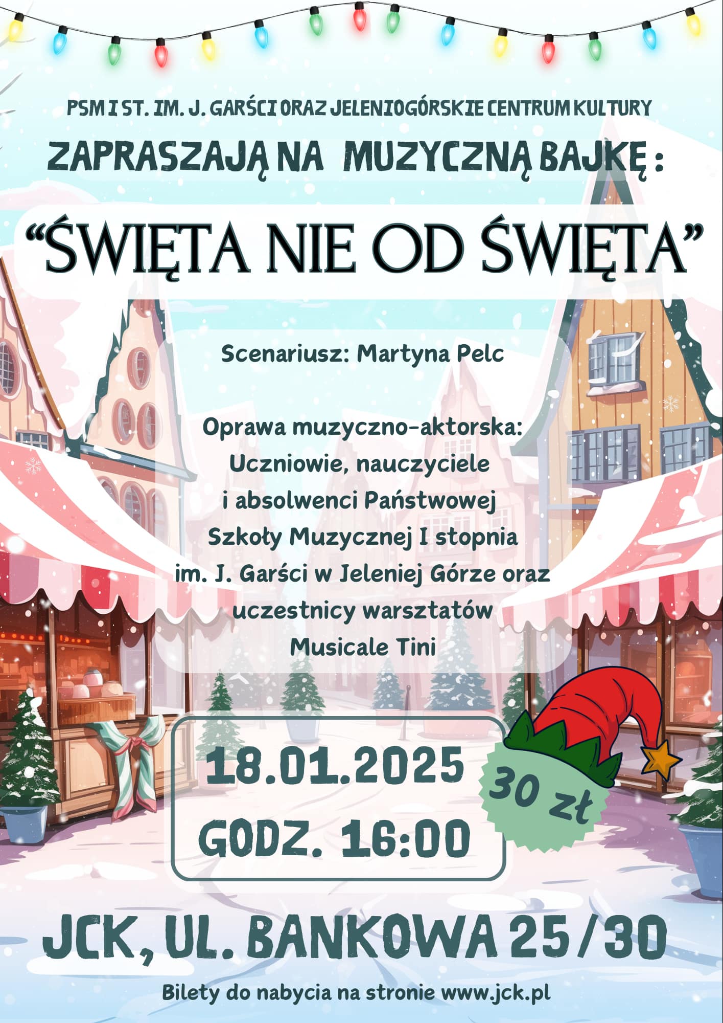 Serddecznie zapraszamy na Koncert Świąteczny pt. "Święta nie od Święta, który odbędzie się w dniu 18 stycznia 2025 r. o godz. 16.00 w Jeleniogórskiem Centrum Kultury przy ul. Banowej 25/30. Bilety do nabycia na stronie www.jck.pl.
