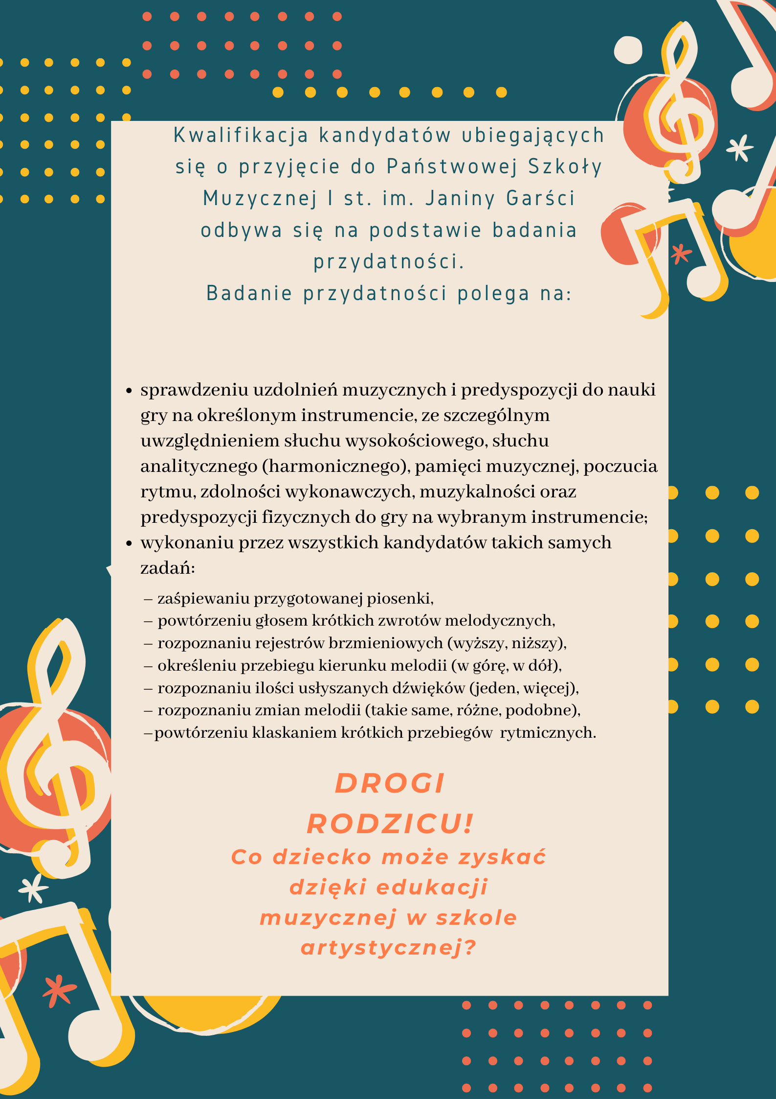 Zakwalifikowanie dziecka do klasy muzycznej nie jest jednoznaczne z jego przyjeciem do szkoły muzycznej. Oznacza jedynie, że dziecko przeszło pozytywnie badanie przydatności.