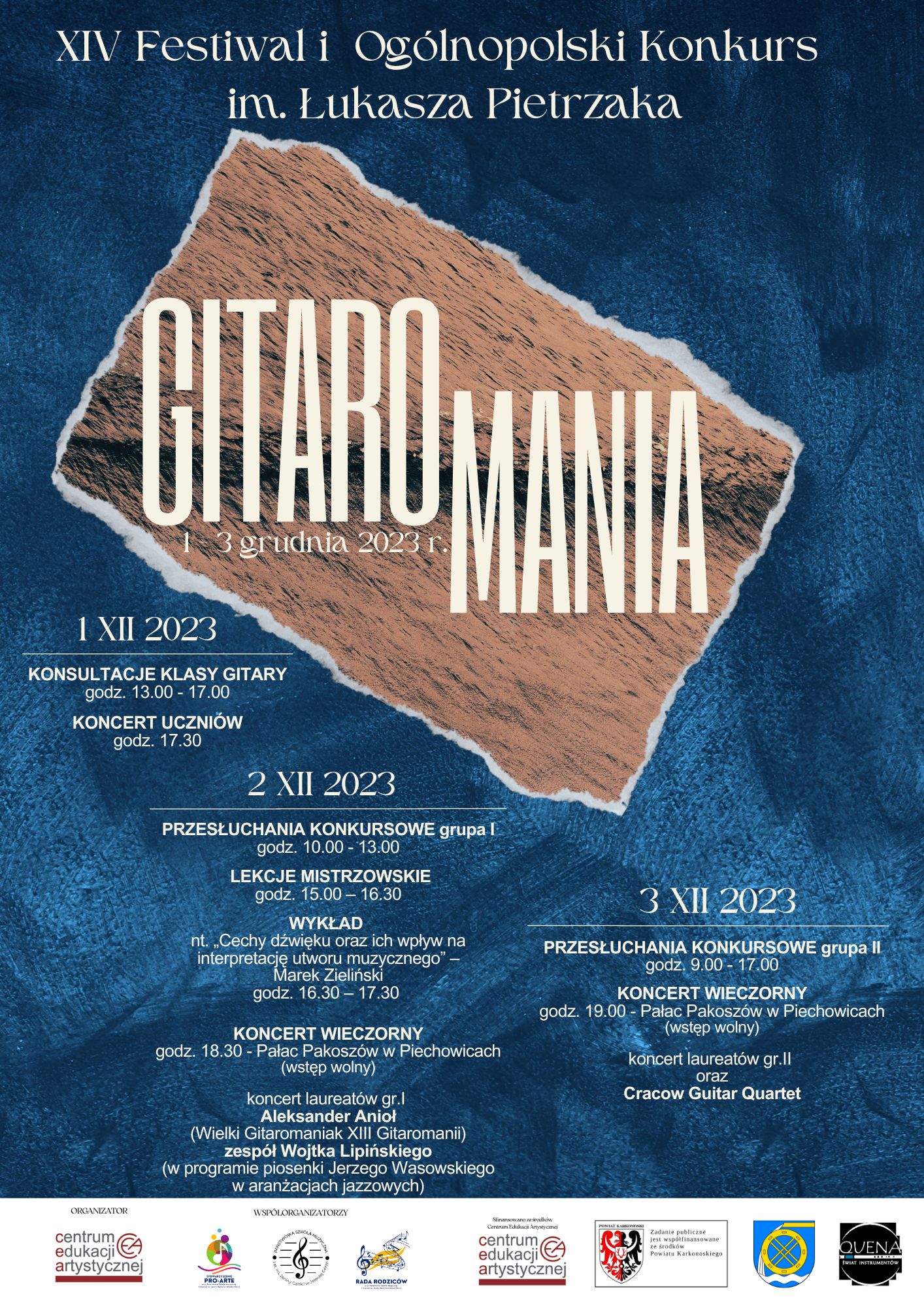 XIV Festiwal i Ogólopolski Konkurs im. Łukasza Pietrzaka "Gitaromania" odbywać się będzie w dniach od 1 do 3 grudnia 2023 r.