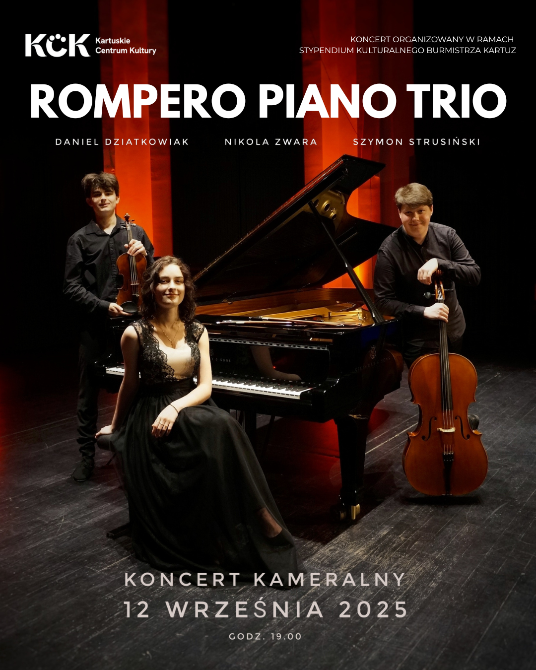 12 września 2025 r. w Kartuskim Centrum Kultury odbył się koncert Rompero Piano Trio. W składzie zespołu znalazła się Nikola Zwara, która jest absolwentką naszej szkoły z klasy fortepianu mgr Wandy Walenczak. Obecnie Nikola studiuje na Akademii Muzycznej w Katowicach pod kierunkiem prof. dr hab. Wojciecha Świtały oraz w Conservatoire Royal de Bruxells w Belgii w klasie prof. Valentiny Igoshiny. Publiczność miała okazję wysłuchania wspaniałych wykonań utworów Brahmsa, Shostakovicha i Ravela.