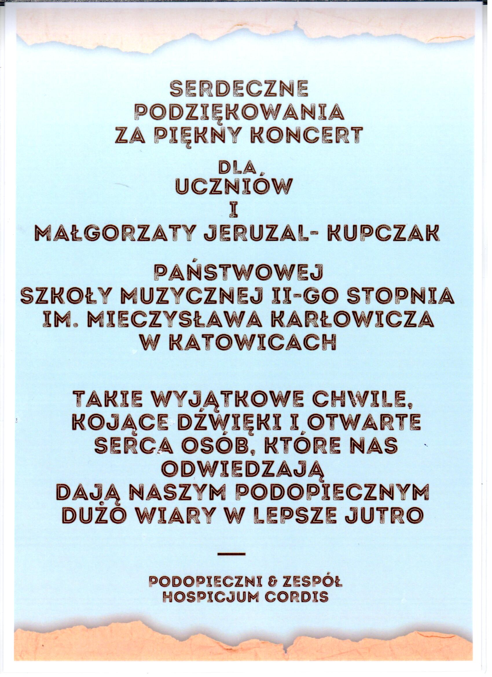 W dniu 6 czerwca br. uczniowie naszej szkoły: Julia Bulandra, Tobiasz Juszczyk, Patrycja Nessing, Zofia Stawicka i Anna Wolska, prowadzeni przez prof. Małgorzatę Jeruzal-Kupczak, odwiedzili Hospicjum Cordis. Za wzruszający koncert otrzymali serdeczne podziękowanie.