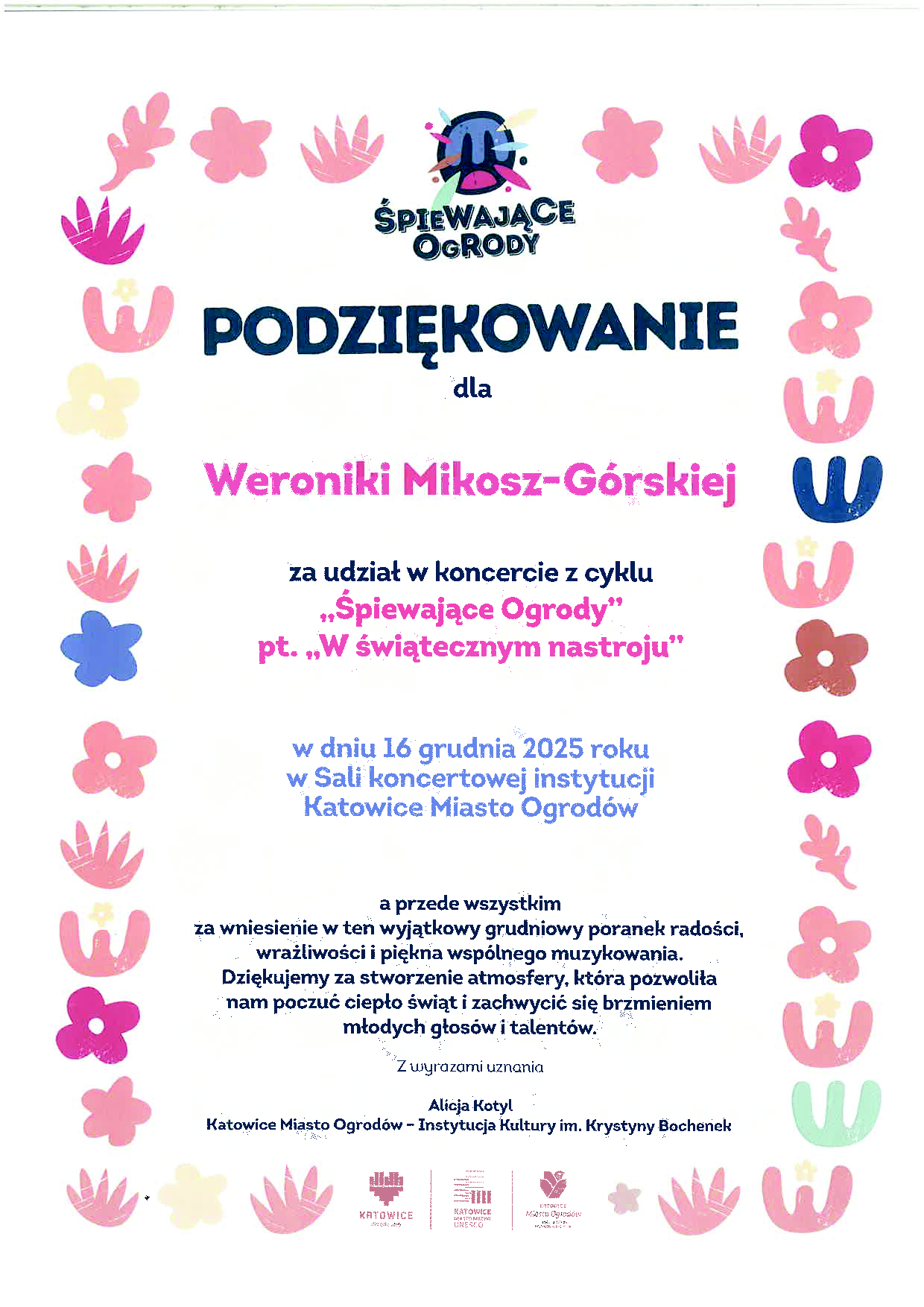 W dniu 16 grudnia 2025 r. w Instytucie Kultury im. Krystyny Bochenek - Katowice Miasto Ogrodów, Zespół smyczkowy Państwowej Szkoły Muzycznej I stopnia pod kierunkiem Pani Danuty Sobik-Ptok , Marka Szopy i Weroniki Górskiej-Mikosz wziął udział w Koncercie z cyklu „Śpiewające ogrody” pt. „W Świątecznym nastroju”. Prowadzący otrzymali dyplomy podziękowania.