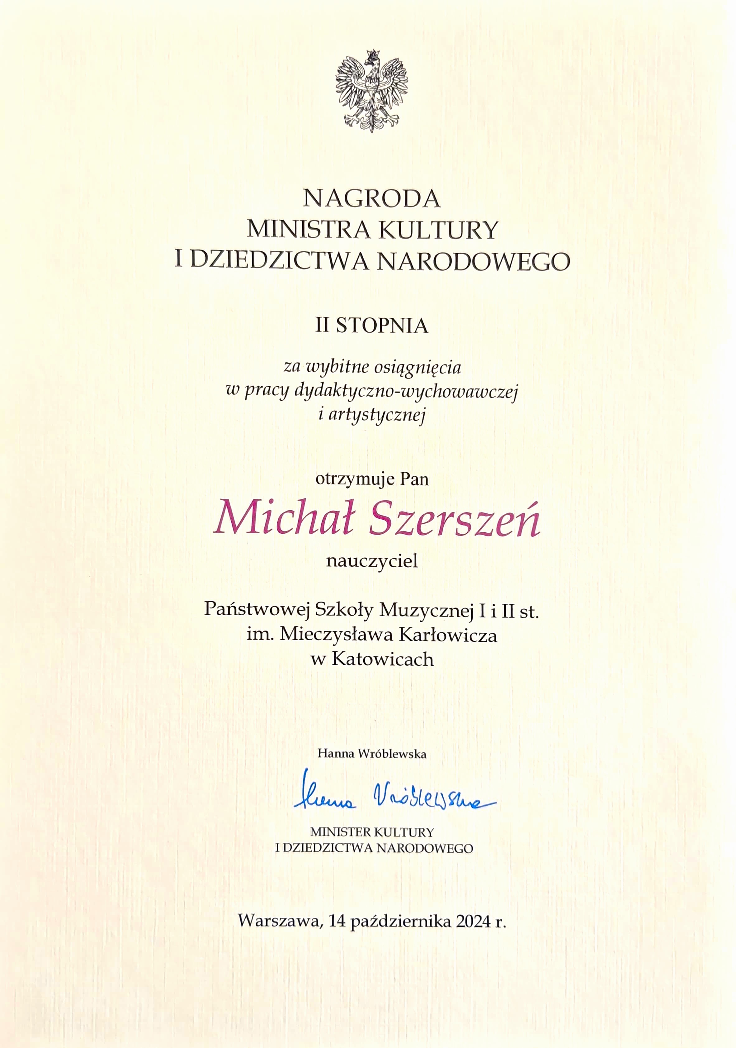 14 października 2024 w dniu Święta Edukacji Narodowej na Zamku Królewskim w Warszawie wręczone zostały nagrody za wybitne osiągnięcia w pracy dydaktyczno-wychowawczej i artystycznej. Z radością informujemy, iż w gronie nagrodzonych znalazł się Pan Michał Szerszeń, pedagog, klarnecista, Kierownik Sekcji Instrumentów Dętych i Perkusji naszej szkoły, któremu przyznana został nagroda Ministra Kultury i Dziedzictwa Narodowego II stopnia. Gratulujemy! Vivat Profesor!