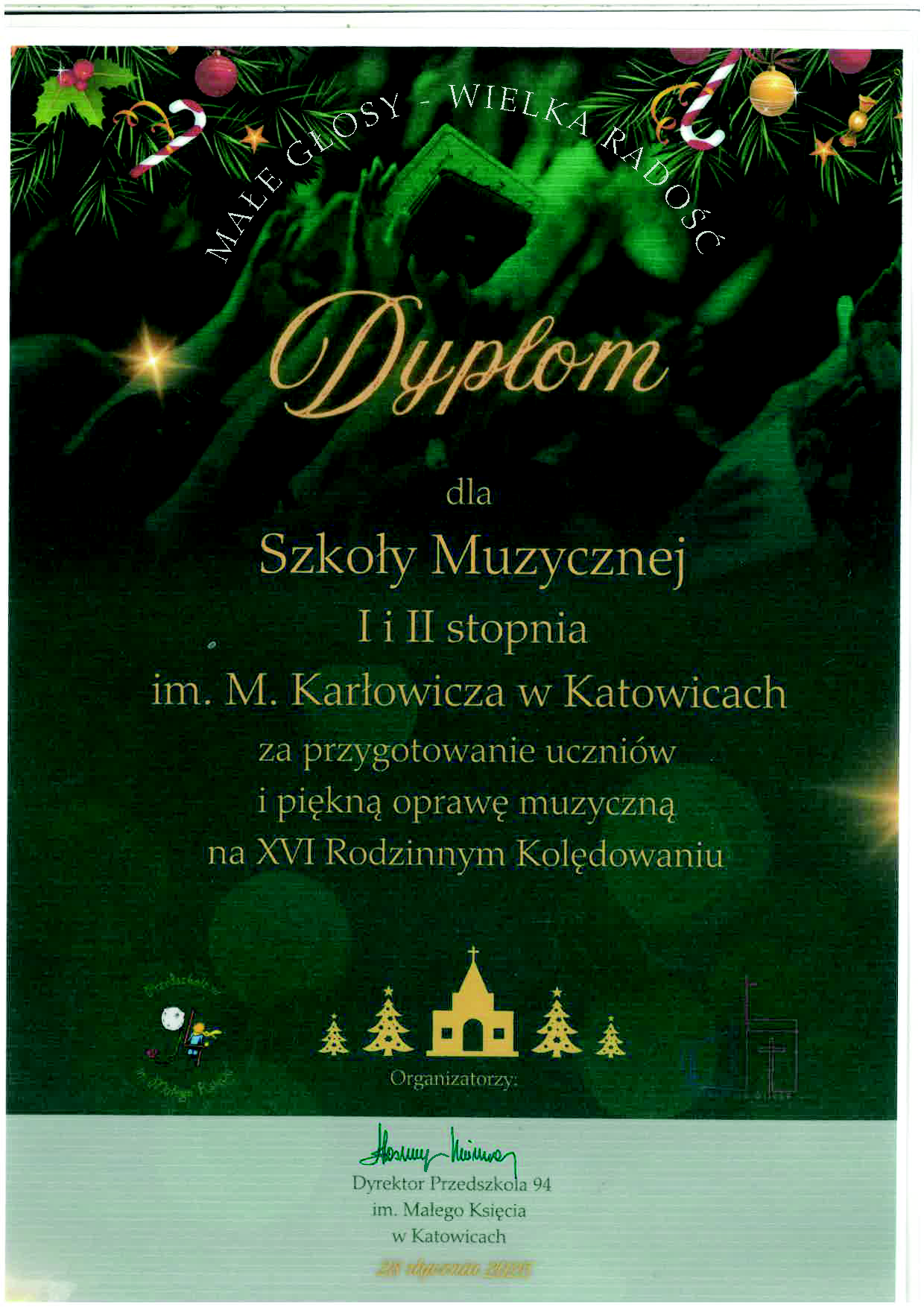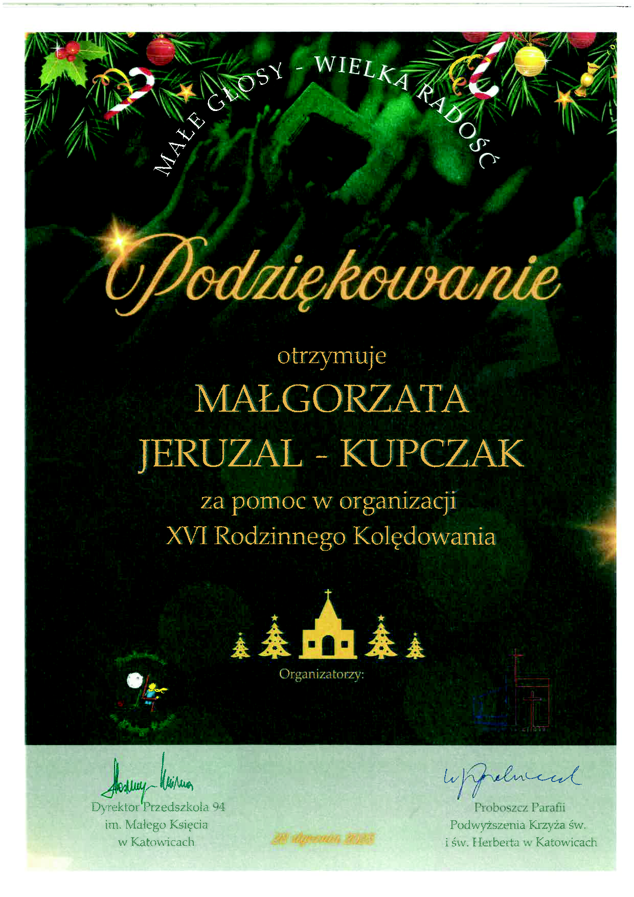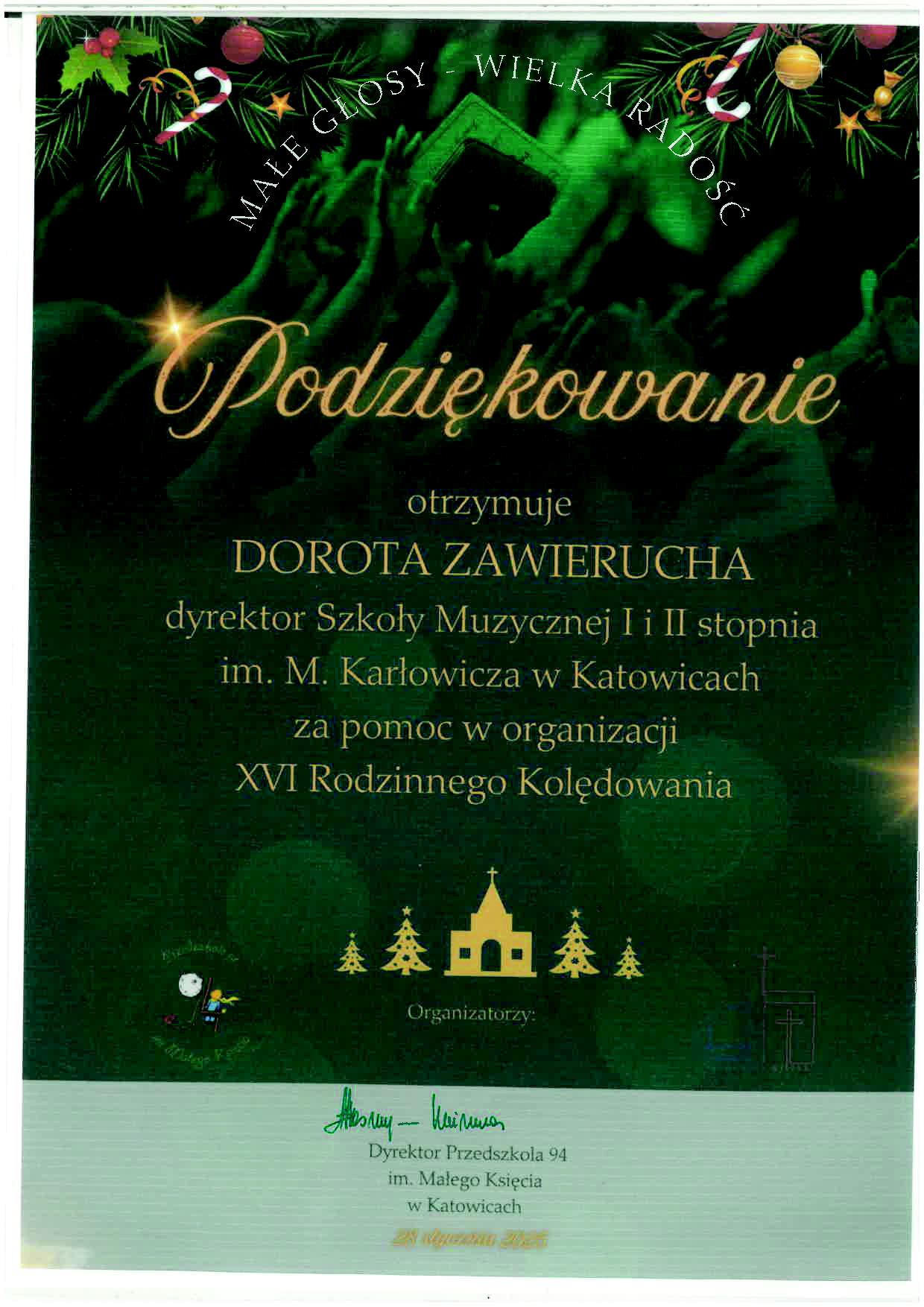 podziękowania dla naszej Szkoły, dla Pani Dyrektor Doroty Zawieruchy oraz Pani Małgorzaty Jeruzal-Kupczak od Dyrektora Przedszkola 94 im. Małego Księcia w Katowicach i Proboszcza Parafii Podwyższenia Krzyża Świętego i Św. Herberta w Katowicach za pomoc w organizacji i udział w XVI Rodzinnym Kolędowaniu w dniu 28 stycznia 2025 r.