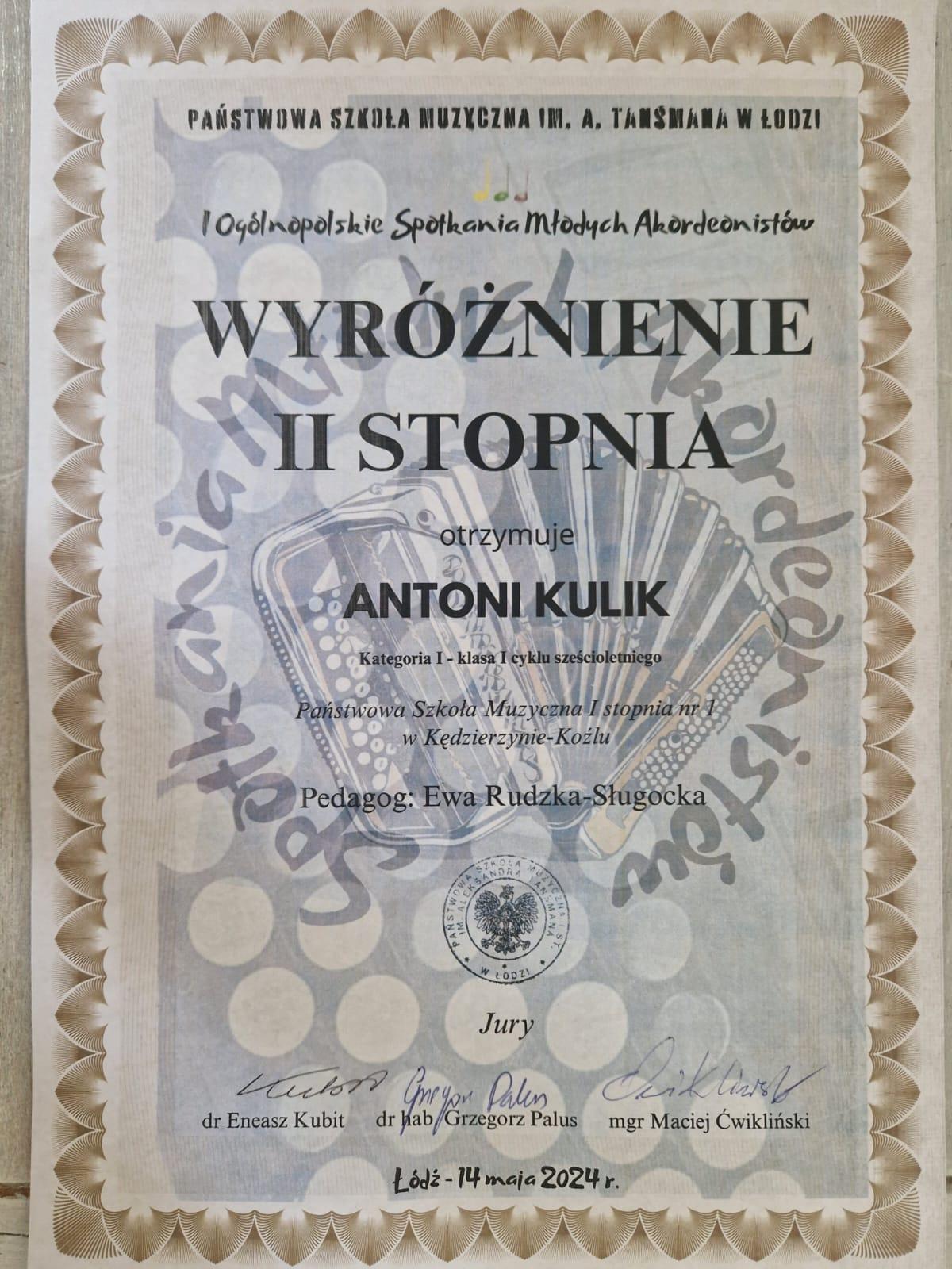 Z radością informujemy, że Antoni Kulik, uczeń Państwowej Szkoły Muzycznej I stopnia nr 1 w Kędzierzynie-Koźlu, zdobył wyróżnienie II stopnia podczas