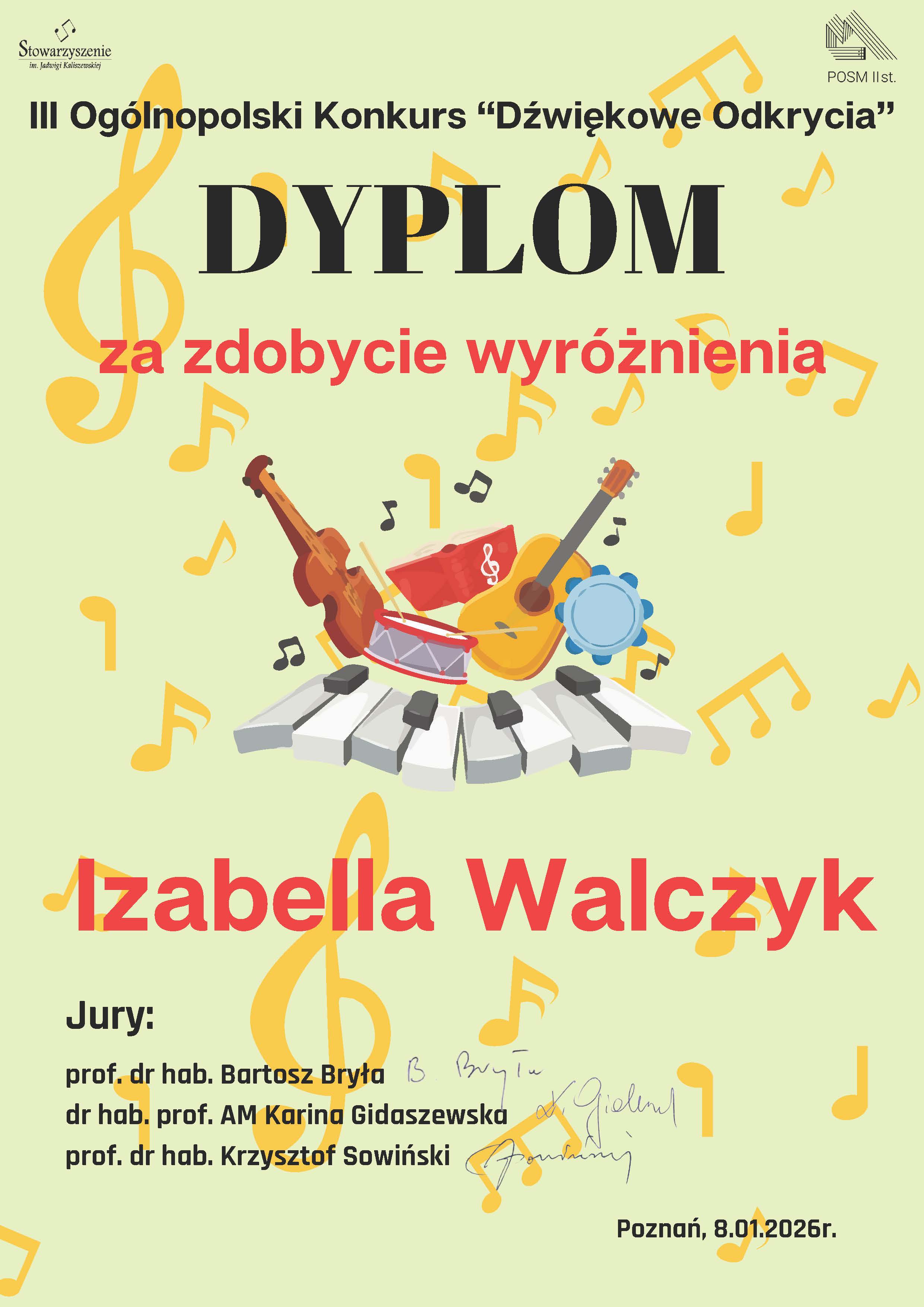 Z radością informujemy, że Izabela Walczyk, uczennica z klasy pani Iryny Bojczuk została laureatką wyróżnienia podczas III Ogólnopolskiego Konkursu “Dźwiękowe Odkrycia”.