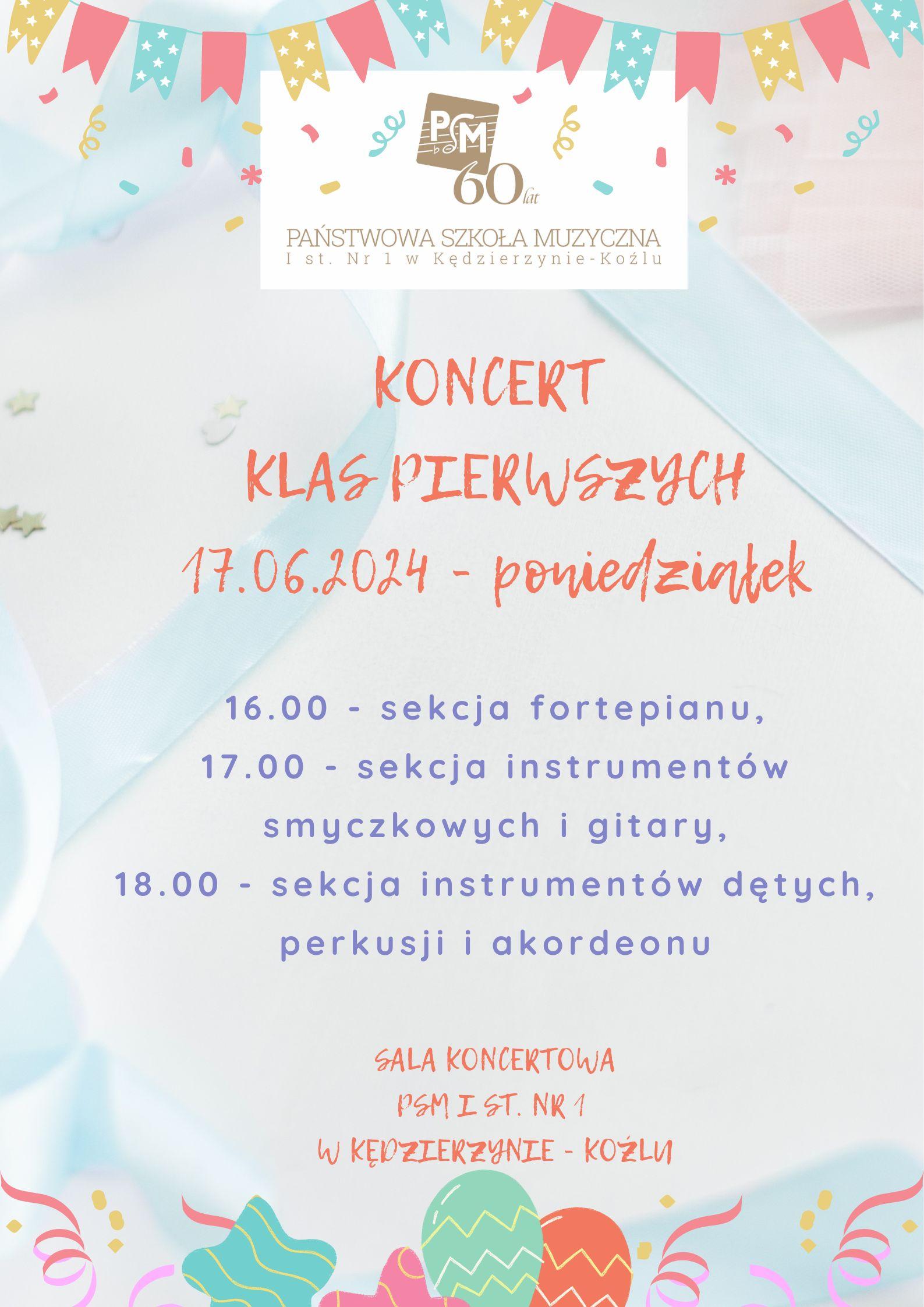 Zapraszamy na Koncert klas pierwszych, który odbędzie się 17 czerwca 2024 roku (poniedziałek) w Sali Koncertowej Państwowej Szkoły Muzycznej I stopnia nr 1 w Kędzierzynie-Koźlu.
