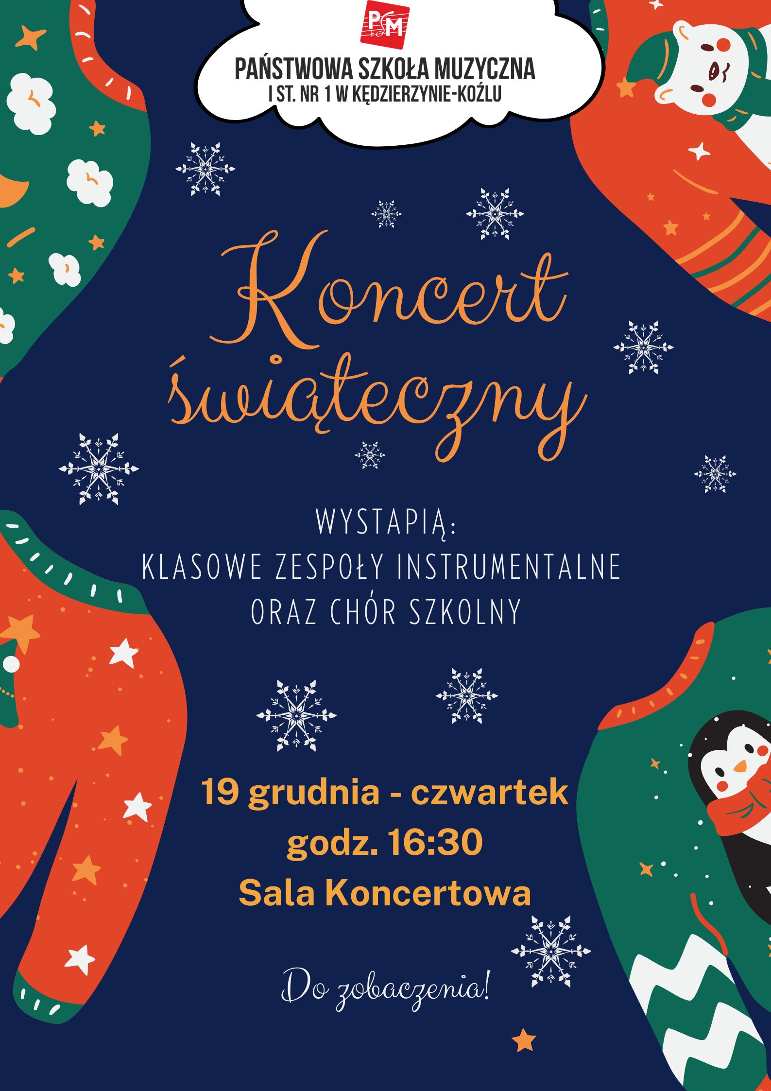 🎄🎶 Serdecznie zapraszamy na Koncert Świąteczny organizowany przez Państwową Szkołę Muzyczną I stopnia w Kędzierzynie-Koźlu! 🎤✨ Wystąpią klasowe zespoły instrumentalne oraz chór szkolny, tworząc niezapomnianą atmosferę pełną muzycznych wrażeń. 🌟 Wydarzenie odbędzie się w czwartek, 19 grudnia, o godzinie 16:30 w Sali Koncertowej naszej szkoły. 🎅❄️ Do zobaczenia! ❤️