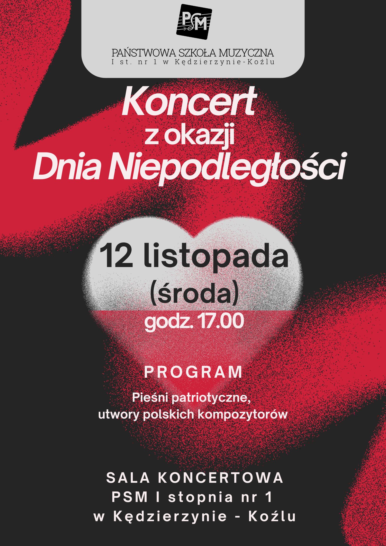 Państwowa Szkoła Muzyczna I stopnia nr 1 w Kędzierzynie-Koźlu serdecznie zaprasza na koncert upamiętniający Święto Niepodległości.