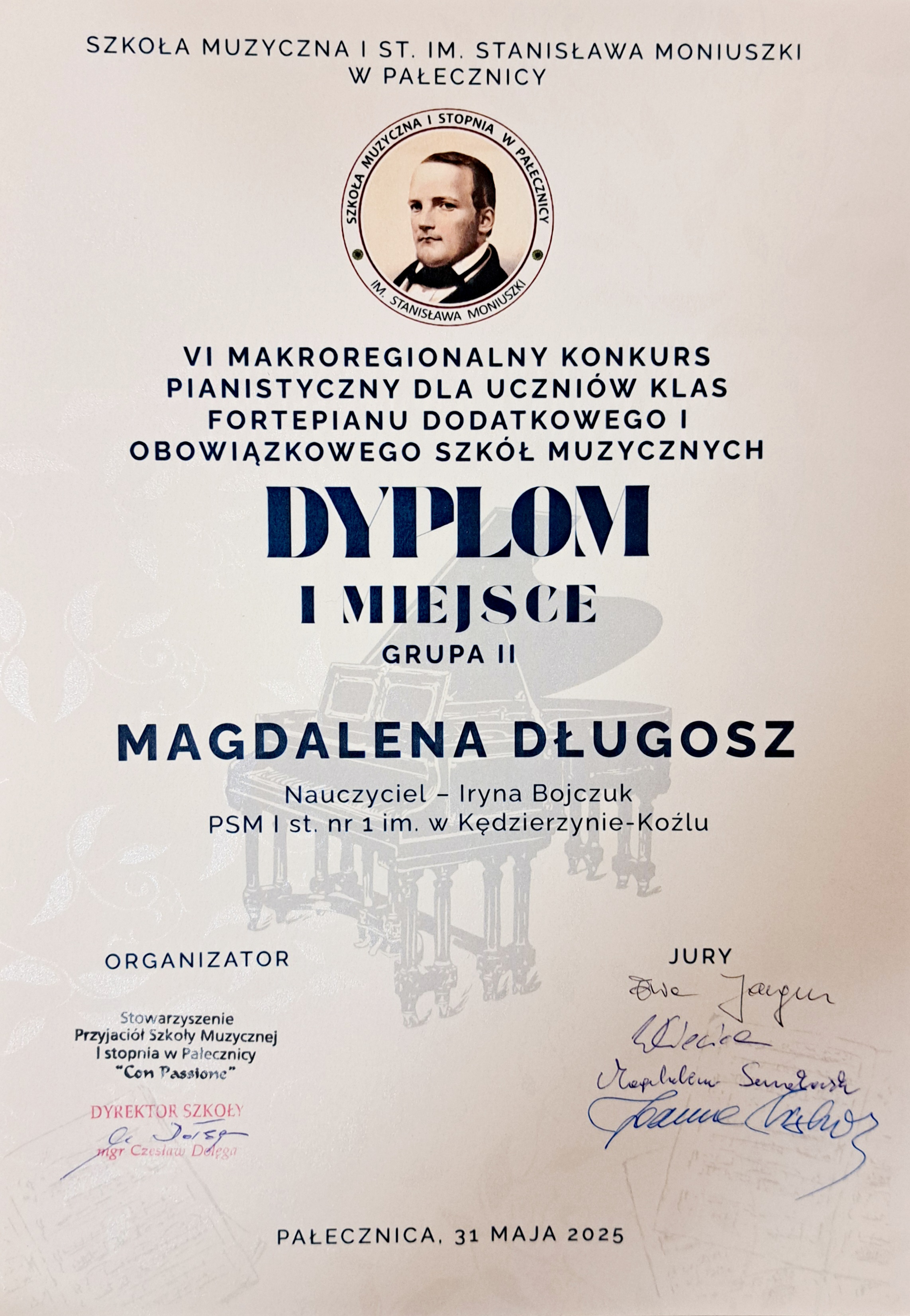 Z radością informujemy, że Magdalena Długosz uczennica Państwowej Szkoły Muzycznej I st. nr 1 w Kędzierzynie-Koźlu, z klasy fortepianu dodatkowego pani Iryny Bojczuk została laureatką I miejsca na VI Makroregionalnym Konkursie Pianistycznym dla uczniów Fortepianu Dodatkowego i Obowiązkowego Szkół Muzycznych.