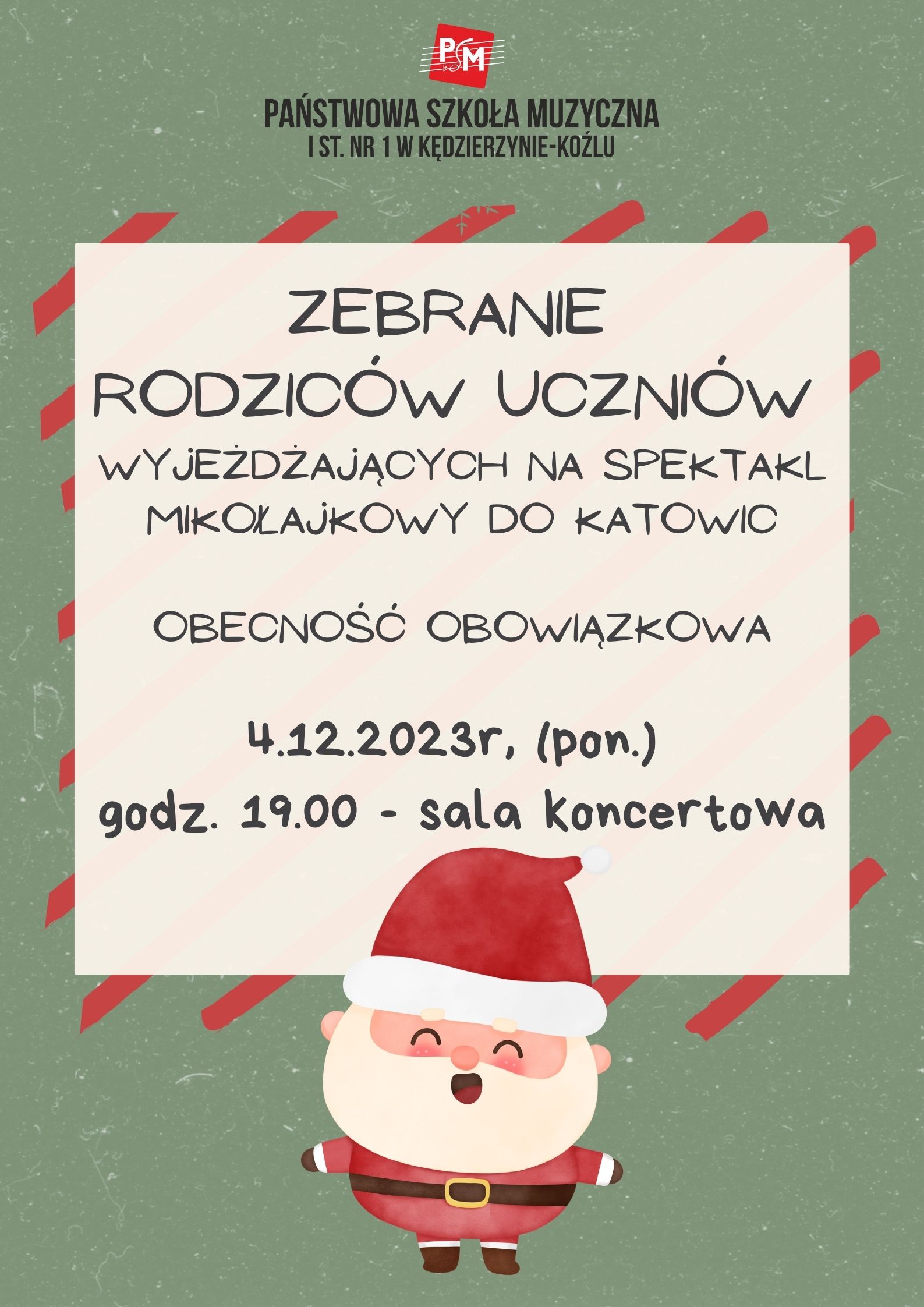 Mikołajki - Zebranie Rodziców Zebranie rodziców uczniów wyjeżdżających na spektakl mikołajkowy do Katowic Obecność obowiązkowa 4.12.2023 r. godz. 19:00 - Sala Koncertowa Zdjęcia (1) Pokaż zdjęcie 1 z galerii.