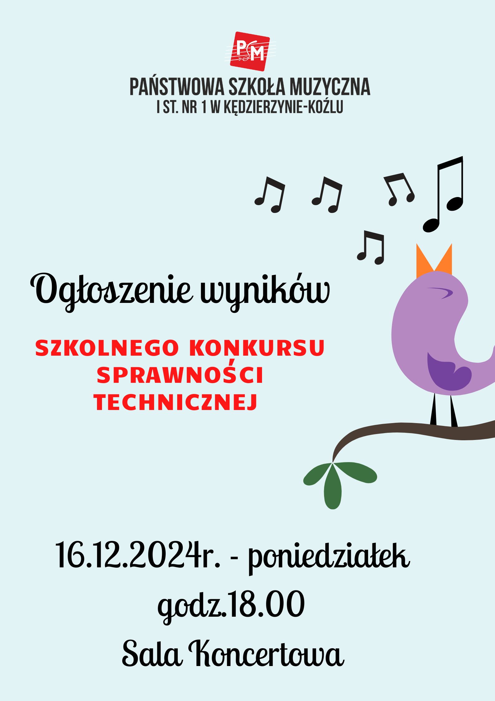 🎵🎉 Zapraszamy na uroczyste Ogłoszenie Wyników Szkolnego Konkursu Sprawności Technicznej! 🏆✨ Spotkajmy się w poniedziałek, 16 grudnia 2024 roku, o godzinie 18:00 w Sali Koncertowej naszej szkoły, by wspólnie świętować sukcesy i osiągnięcia uczestników. 🎶🐦 Niech muzyka i techniczne zdolności połączą się w wyjątkowym wydarzeniu! 💫