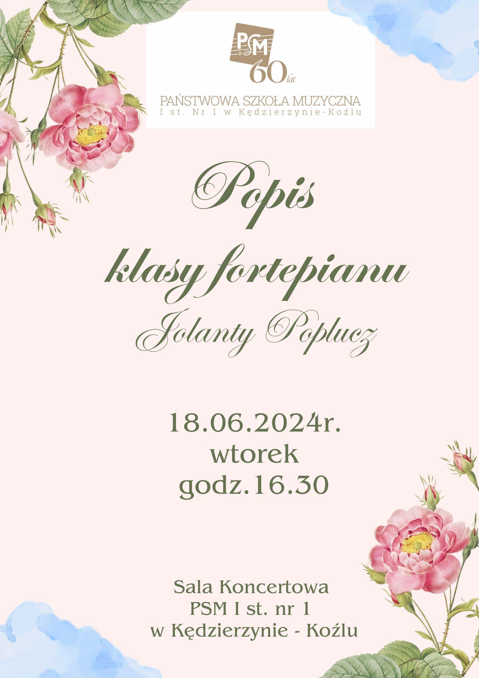 Popis odbędzie się 18 czerwca 2024 roku (wtorek) o godzinie 16:30 w Sali Koncertowej Państwowej Szkoły Muzycznej I stopnia nr 1 w Kędzierzynie-Koźlu.