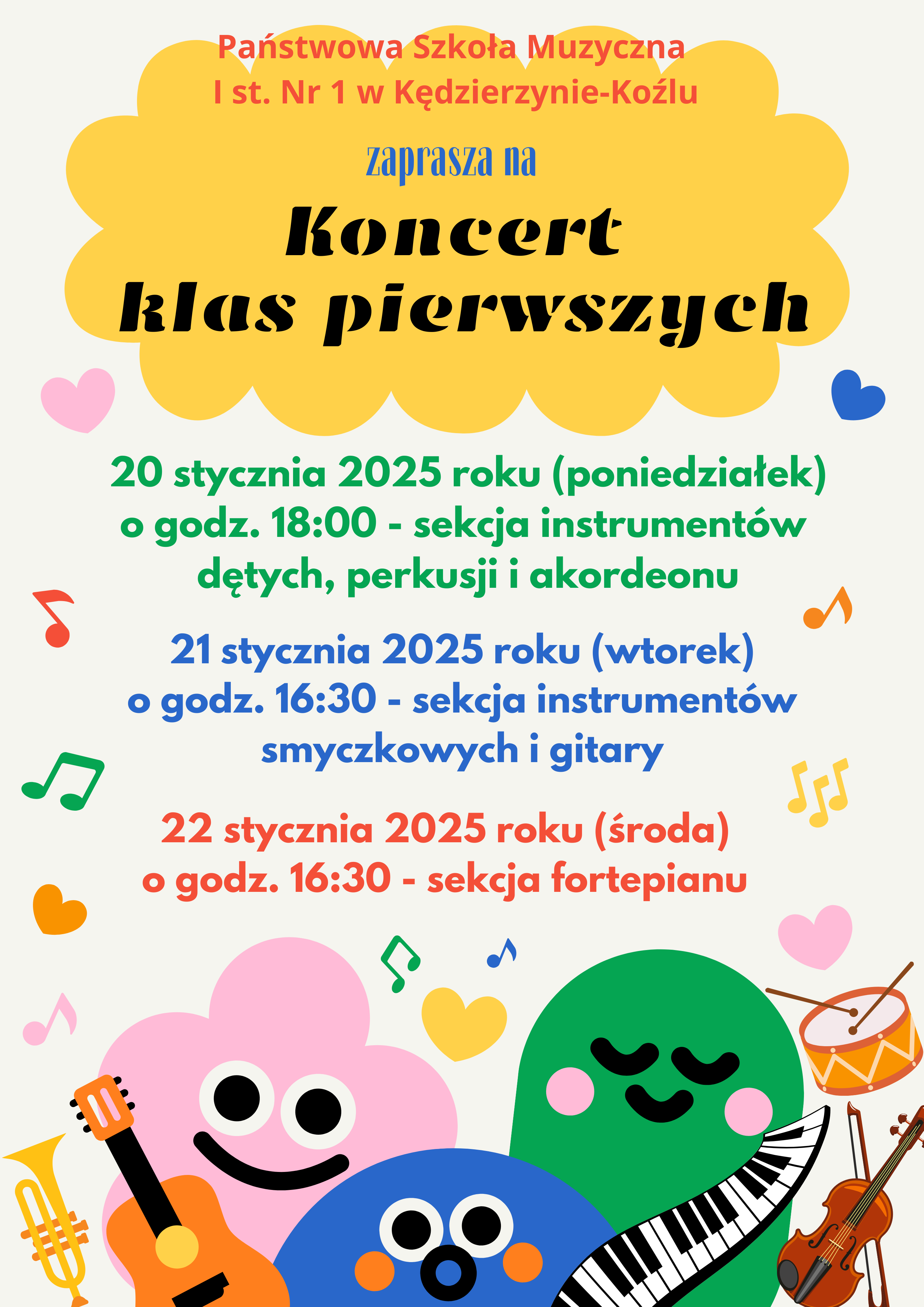 Państwowa Szkoła Muzyczna I st. Nr 1 w Kędzierzynie-Koźlu zaprasza na Koncert Klas Pierwszych! 🎉