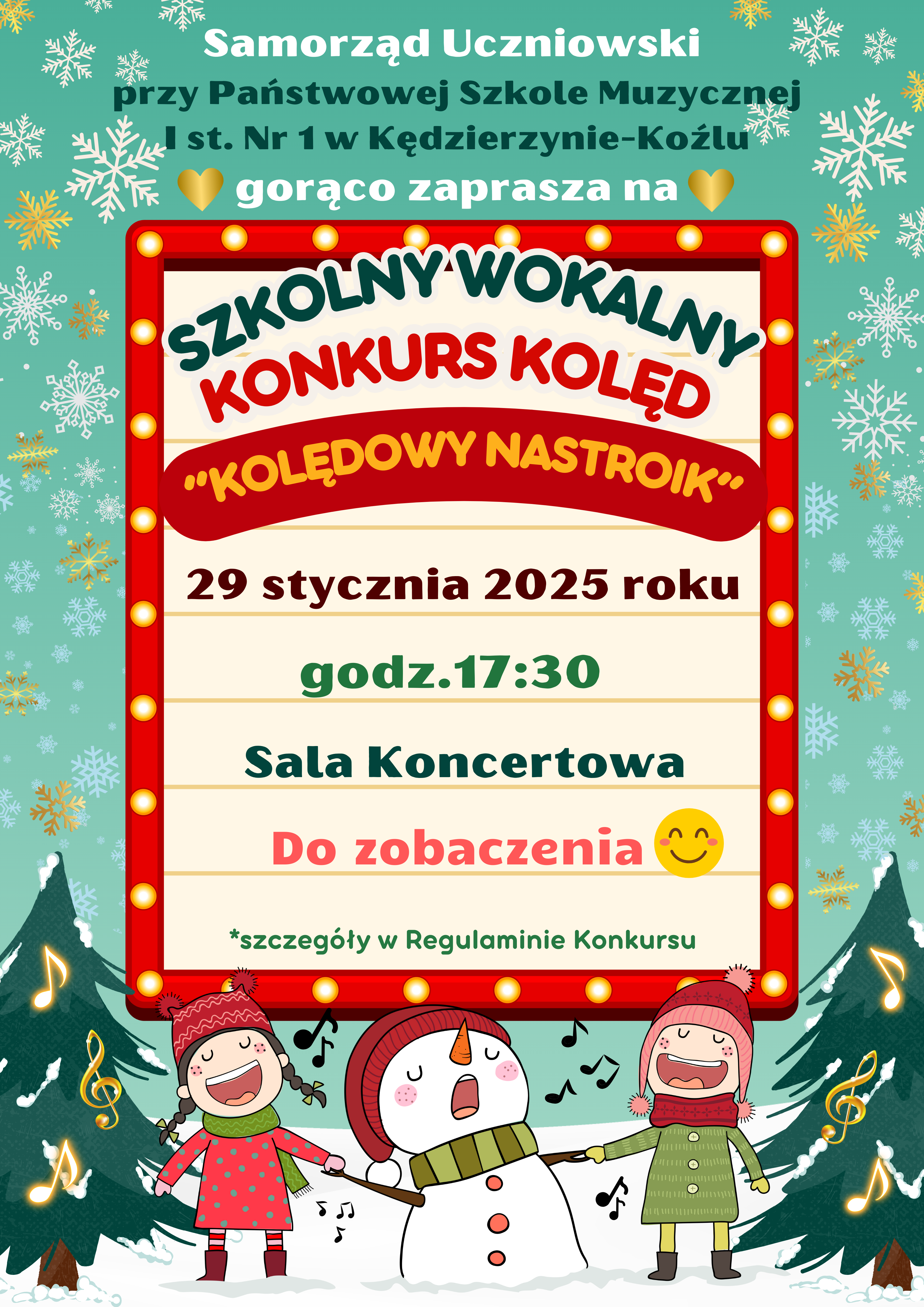 Samorząd Uczniowski przy Państwowej Szkole Muzycznej I st. Nr 1 w Kędzierzynie-Koźlu serdecznie zaprasza na pełen magii i świątecznych emocji Szkolny Wokalny Konkurs Kolęd „Kolędowy Nastroik”