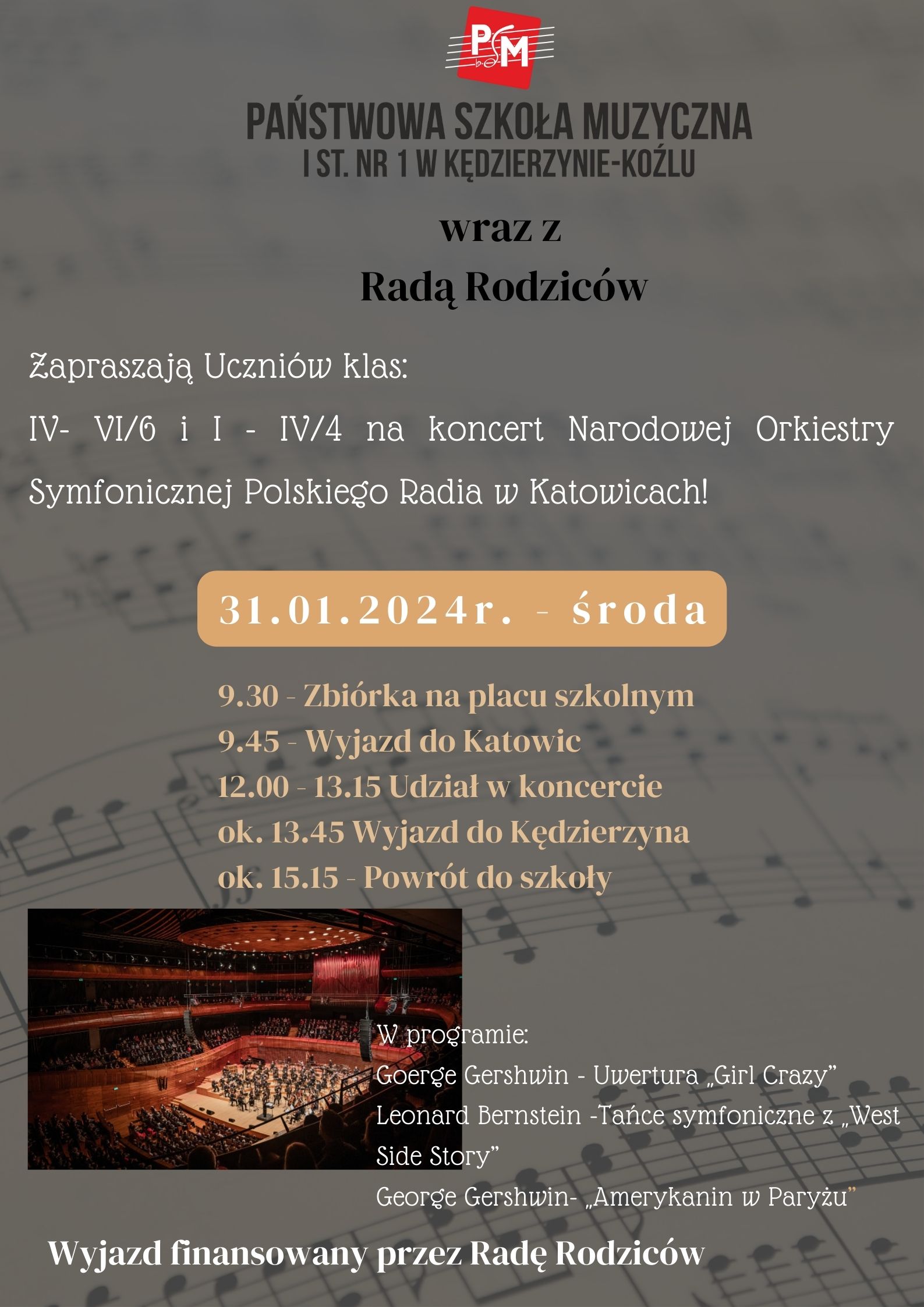 Serdecznie zapraszamy uczniów klas IV-VI oraz I-IV do wzięcia udziału w wyjątkowym wydarzeniu muzycznym – koncercie Narodowej Orkiestry Symfonicznej Polskiego Radia, który odbędzie się w prestiżowej sali koncertowej w Katowicach. Wyjazd zaplanowany jest na środę, 31 stycznia 2024 roku.