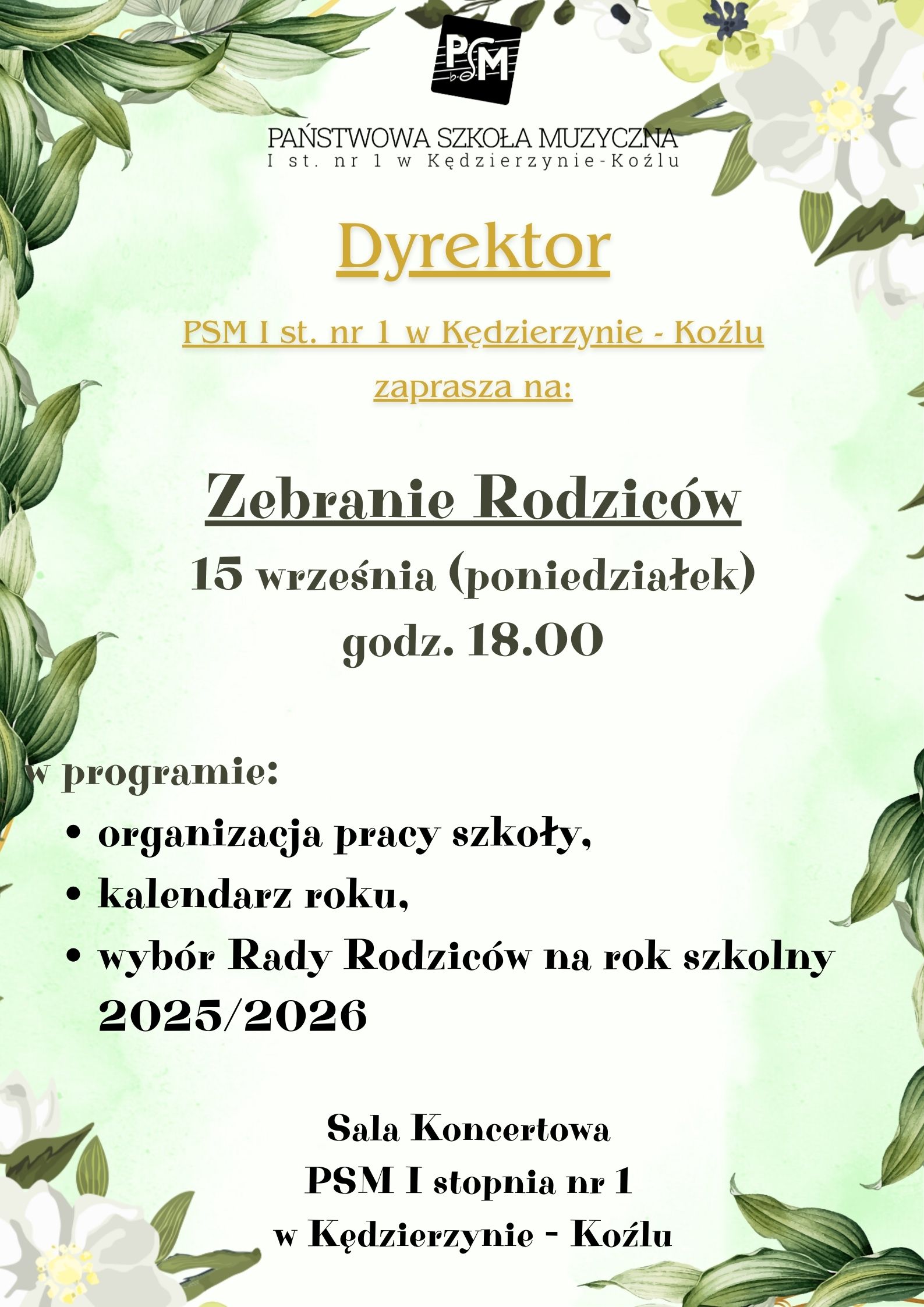 Dyrektor Państwowej Szkoły Muzycznej I stopnia nr 1 w Kędzierzynie-Koźlu zaprasza na: