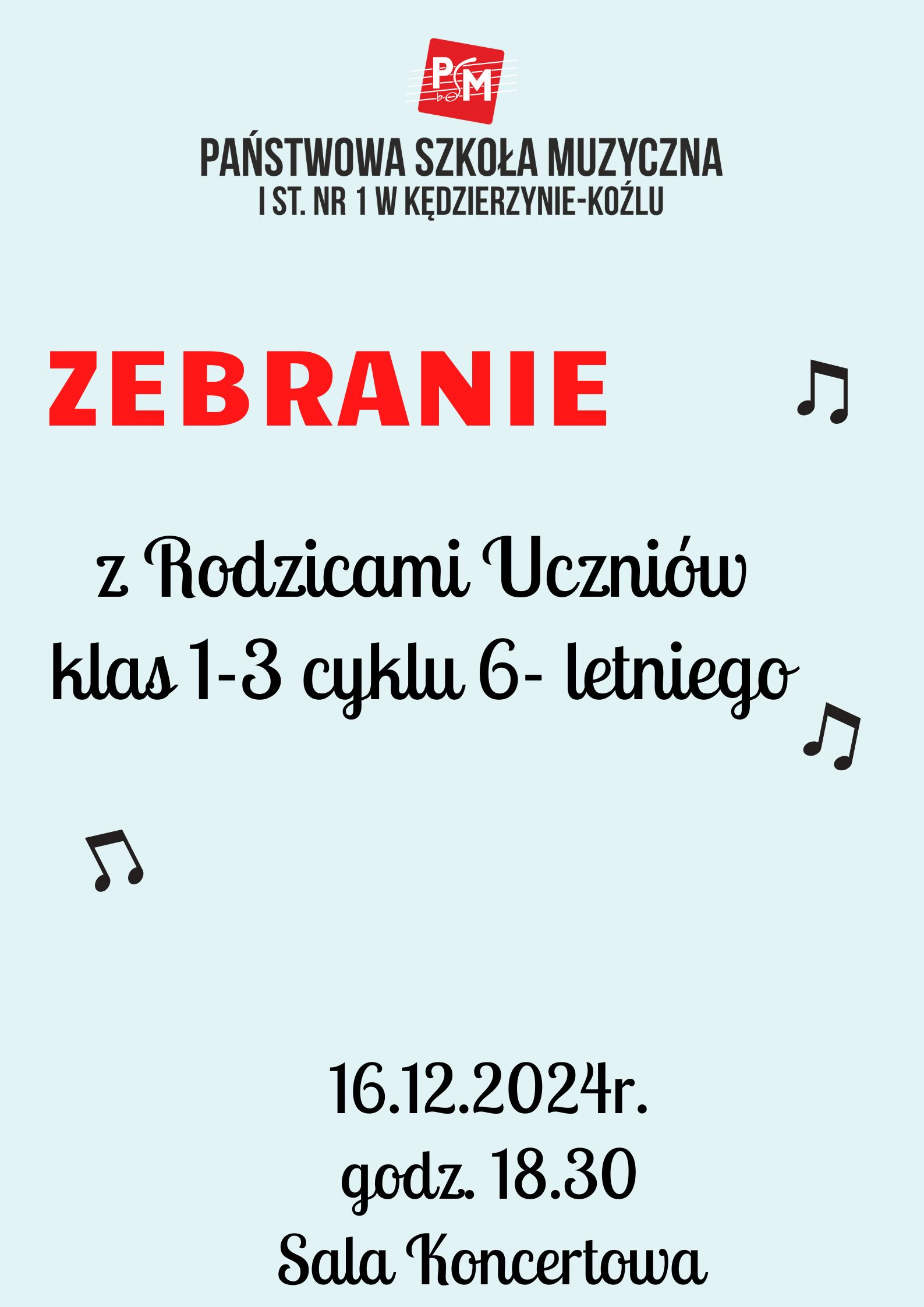Zapraszamy Rodziców Uczniów klas 1- 3 cyklu 6 letniego na zebranie dotyczące zmian w planie oraz zastępstw z przedmiotów rytmika i kształcenie słuchu.