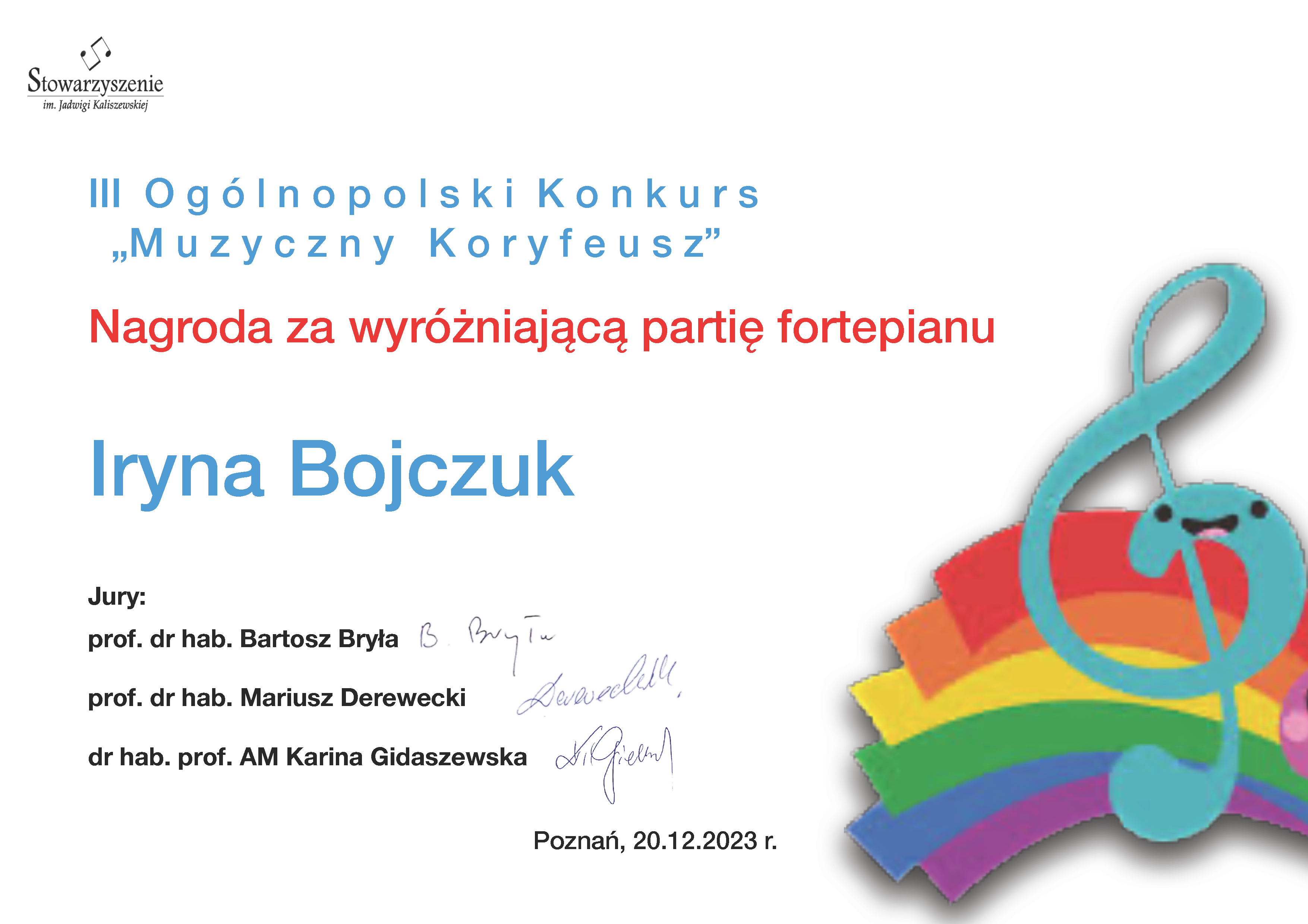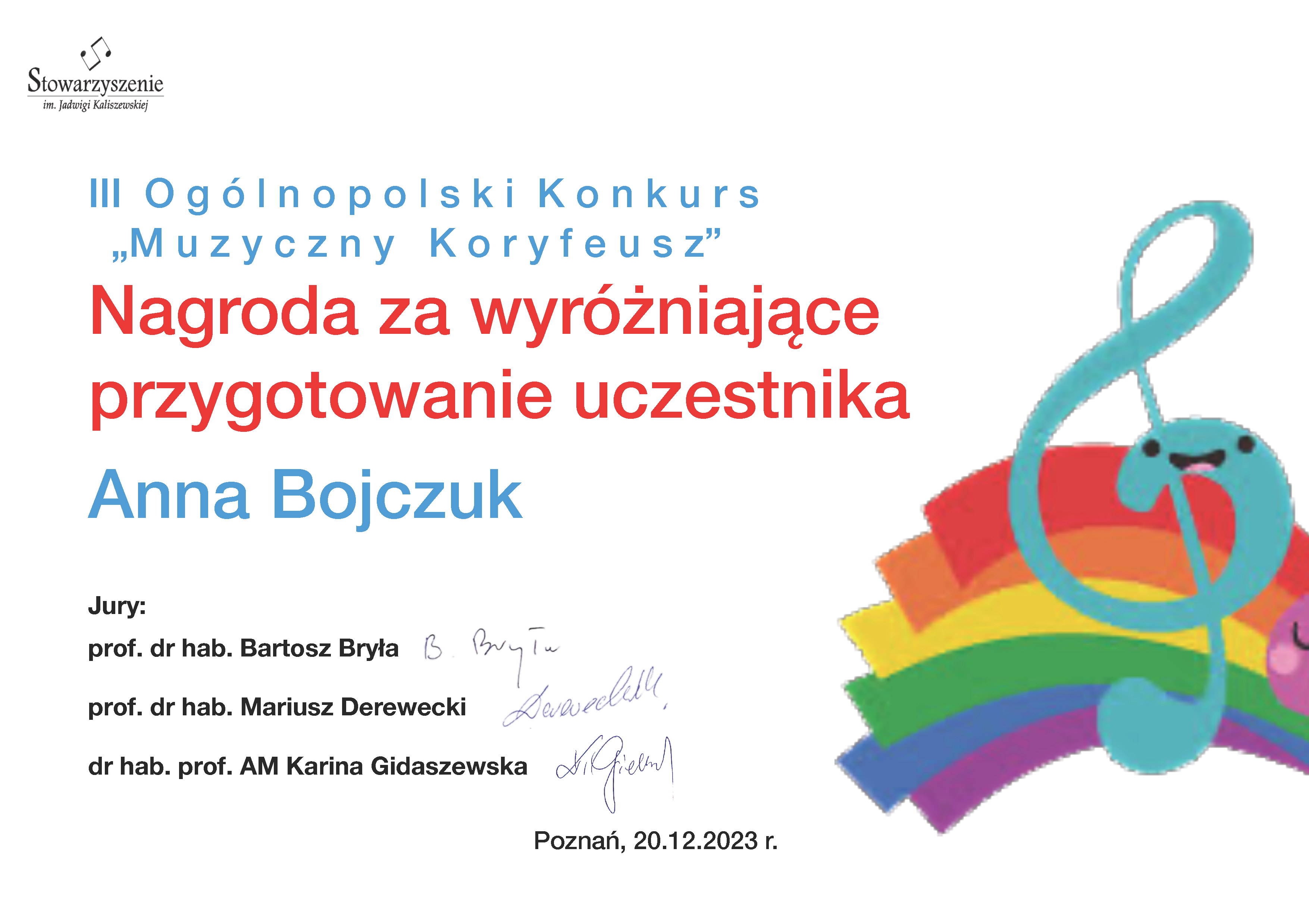 Ponadto pragniemy wspomnieć, że p. Anna Bojczuk, otrzymała nagrodę za wyróżniające przygotowanie uczennicy, natomiast p. Iryna Bojczuk, została nagrodzona za wyróżniającą partię fortepianu.