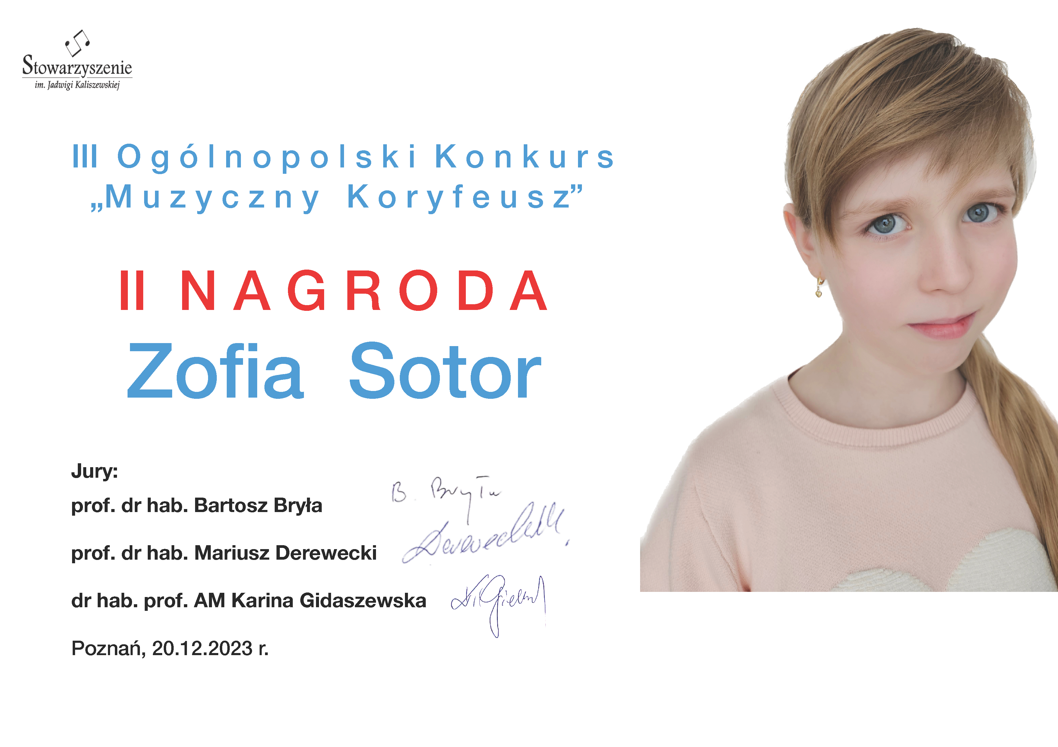 Z radością informujemy, że Zofia Sotor, uczennica naszej szkoły, zdobyła II miejsce w III Ogólnopolskim Konkursie "Muzyczny Koryfeusz".